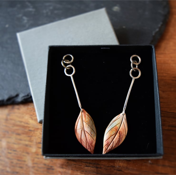 Living in the countryside, and seeing the autumn leaves change colour and fall, inspired me to create this collection of earrings. Beautiful carved gemstone leaves hang from hand fabricated sterling silver settings. I hope you love them as much as I do