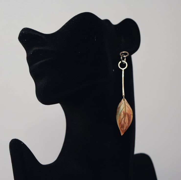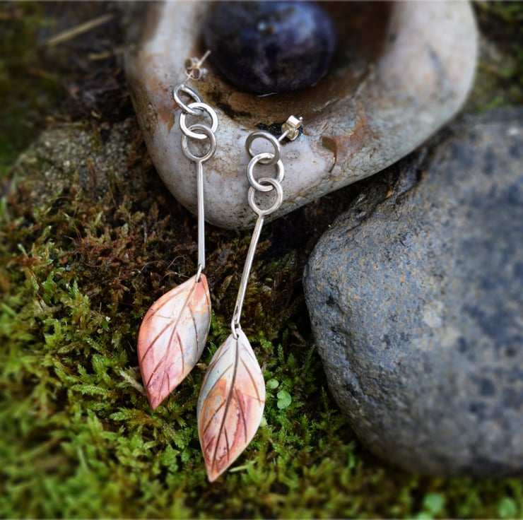 Sterling silver long earrings with hand carved picasso jasper leaves. These earrings are hand made by me, and one of a kind.