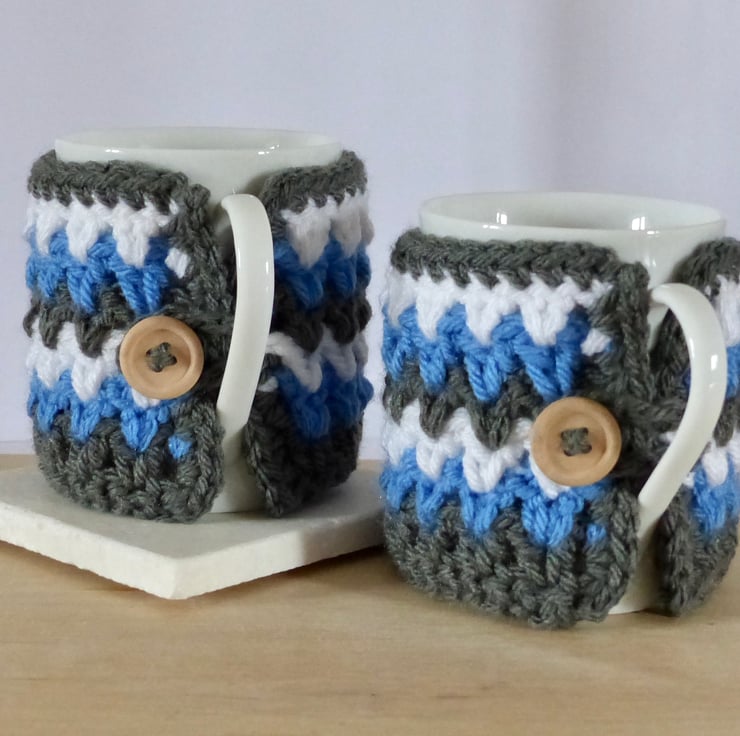 A pair of crocheted mug cosies in grey, blue and white chunky acrylic yarns. They measure approximately 25cm long by 9cm high so should fit most standard mugs. Just wrap them around your mug and fasten with the crocheted loop and natural wood button. An ideal gift for a tea/coffee lover.