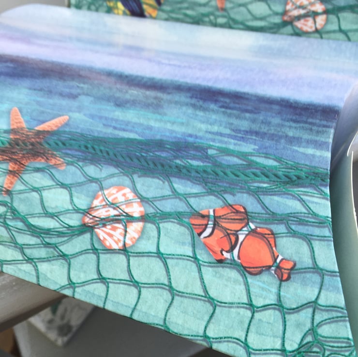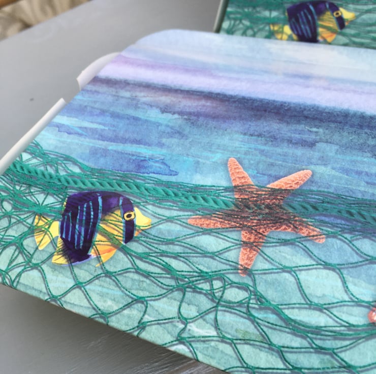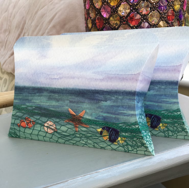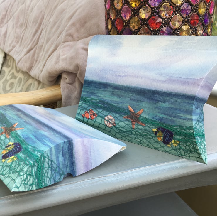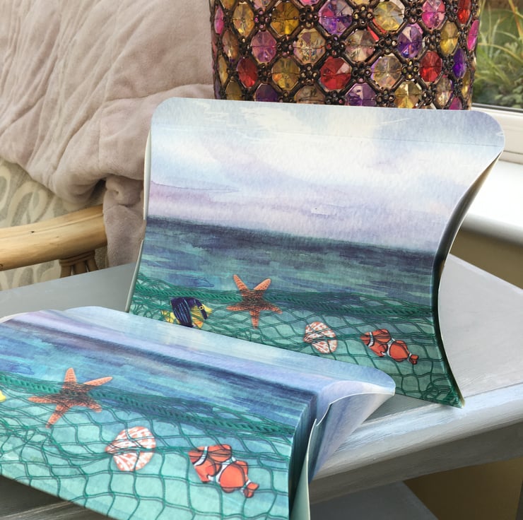 A lovely way to send a special gift. A hazy watercolour style sea scene with a fishing net at the bottom. The net has a starfish, scallop, clown fish and an angel fish depicted behaind it. A lovely wrapping for a gift to a man but not exclusively, what ever your taste it makes an unusual way to send a gift. It is 7.5x6.25 inches so can hold a reasonable gift.