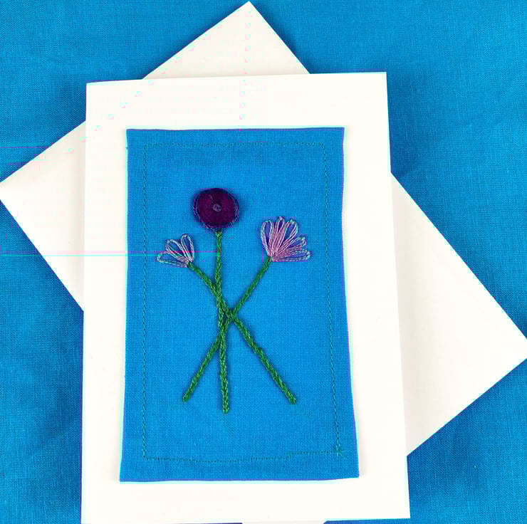 Three pretty embroidered single stem flowers in a variety of purples. The flowers are set on blue cotton on a white card with matching envelope. The inside is left blank for your own message.
