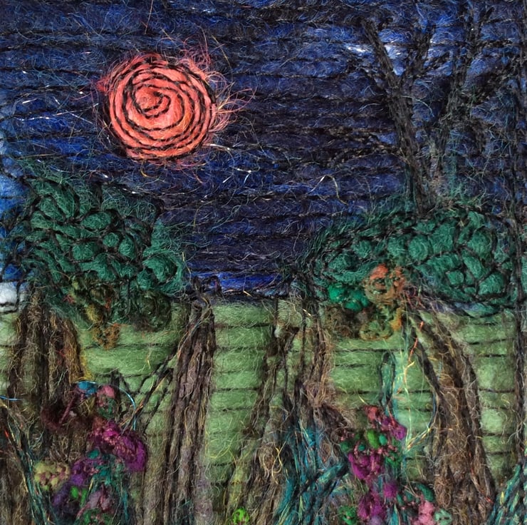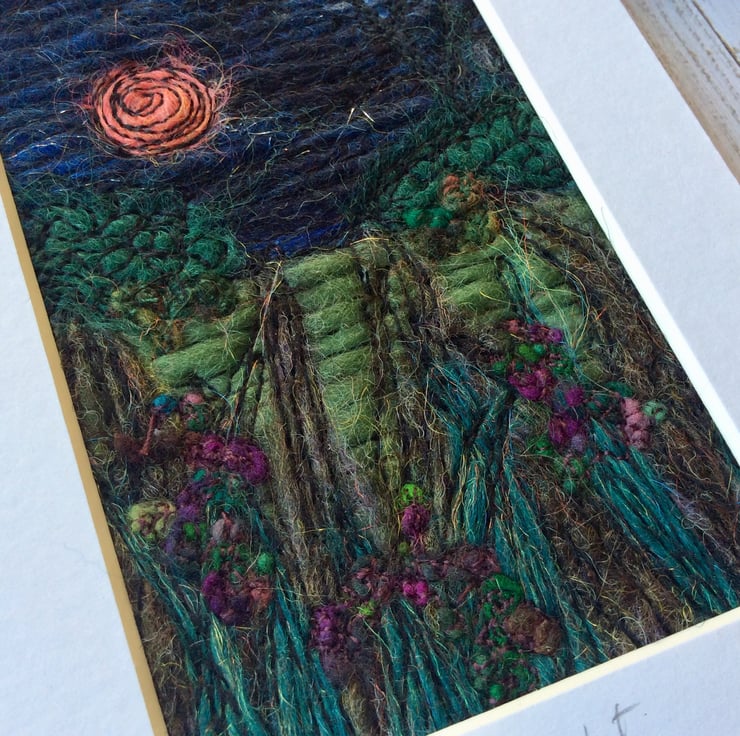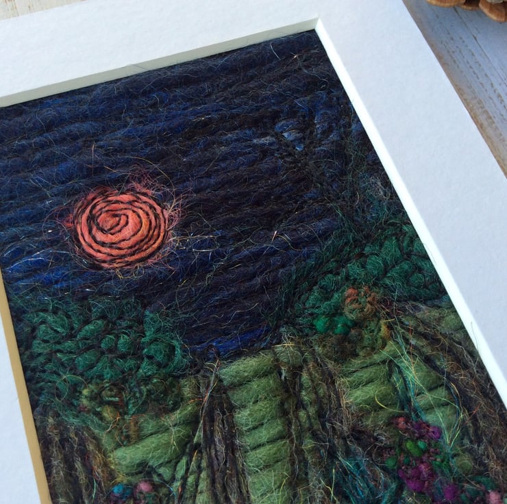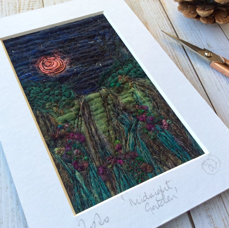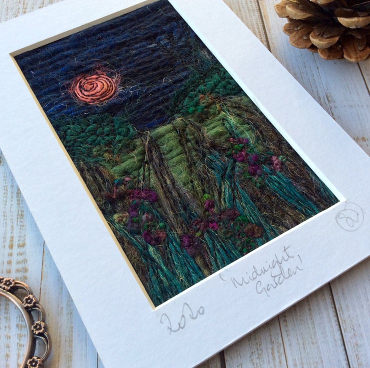 This embroidered needle felted midnight garden has been enhanced with flowers, a full moon, sparkles and free motion embroidery. It’s felt backed, mounted and with a plastic cover for protection. The mount measures 103 x 147mm and the mount window measures 66 x 110mm.