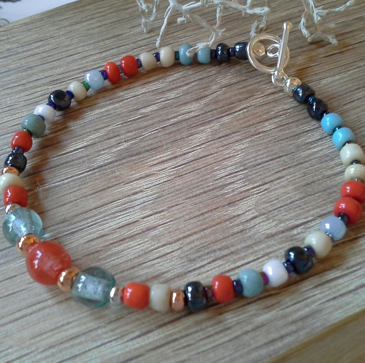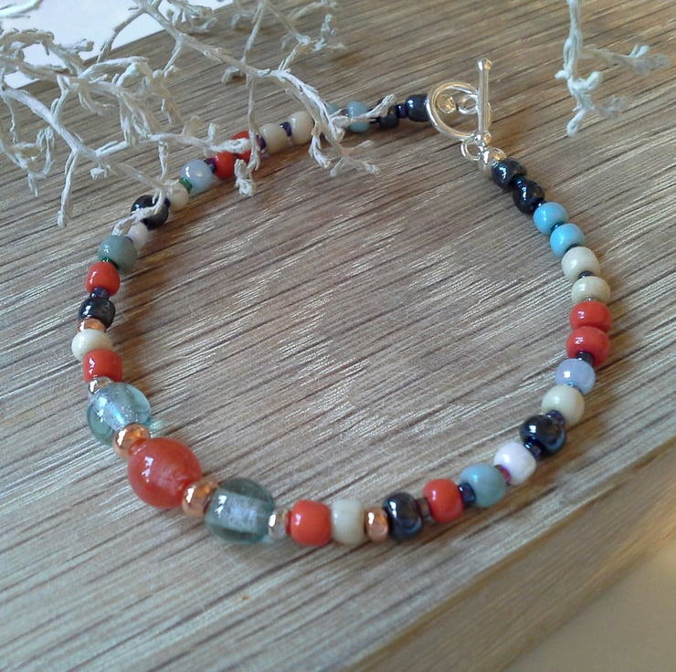 A very pretty dainty feminine bracelet designed and hand crafted using irregular cut glass seed beads with one orange larger centre glass bead and two pale blue glass beads complimented with rose gold and silver plated beads.