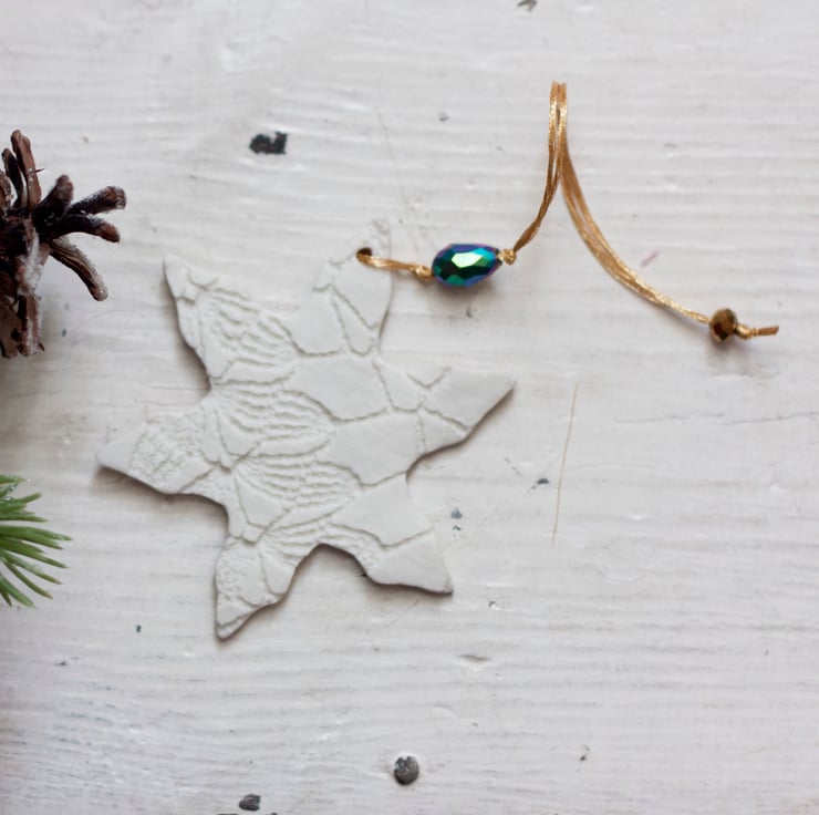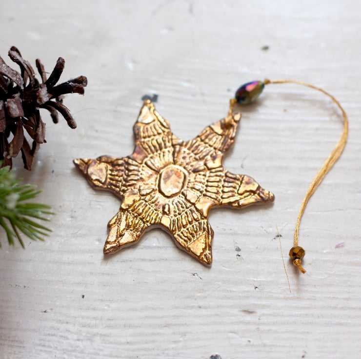 This is a fine porcelain snowflake that has been imprinted on both sides with lace, before going through its first firing. It is then glazed, and has its second firing. Finally, each decoration is hand painted with 22ct gold lustre to give the gold finish and goes through a third and final firing.