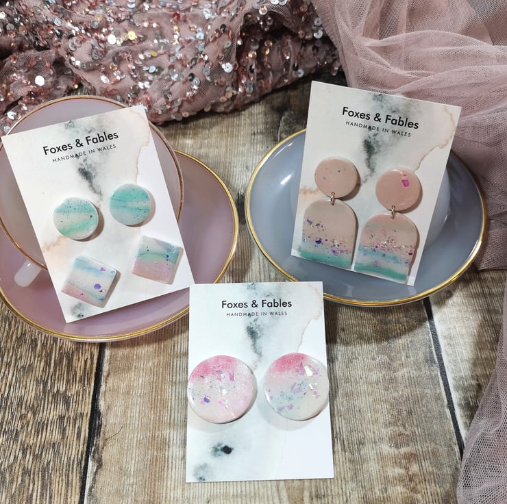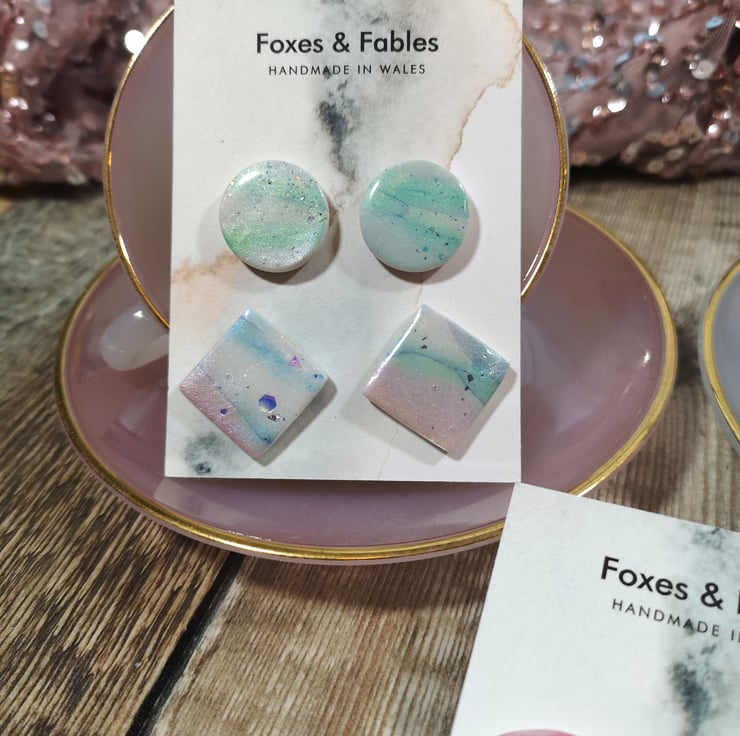 One of a kind handmade stud earrings made from polymer clay with sterling silver backs. Shimmering mica powders and glitter have been worked into the clay and then resin has been applied to the surface which gives the earrings a great shine. This piece is a set of circular studs and square in greens and pinks.