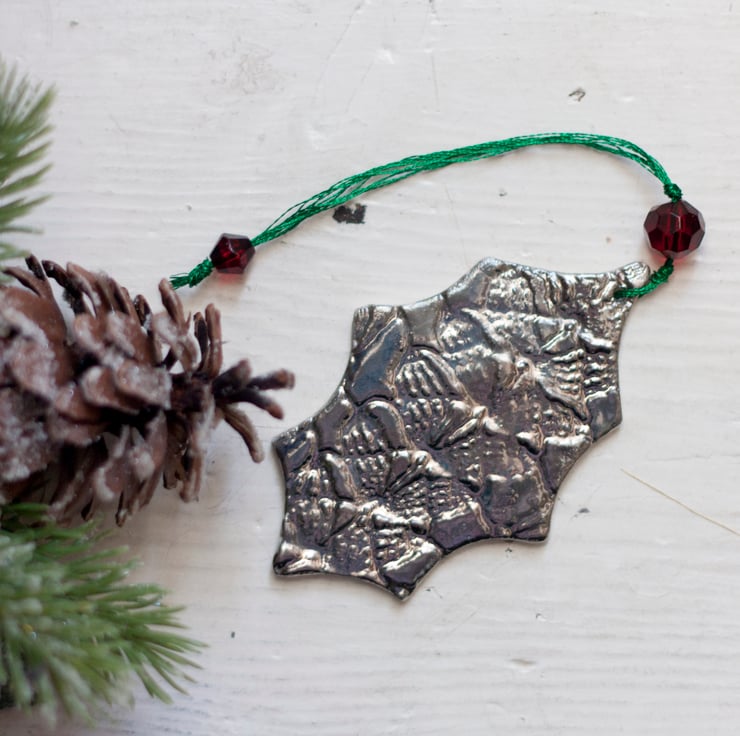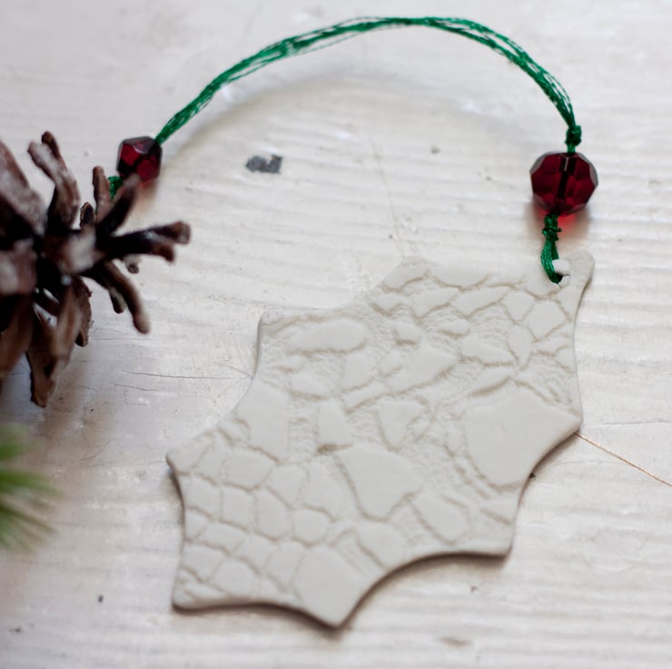 This is a fine porcelain holly leaf that has been imprinted on both sides with lace, before going through its first firing. It is then glazed, and has its second firing. Finally, each decoration is hand painted with platinum lustre to give a metallic finish and goes through a third and final firing.