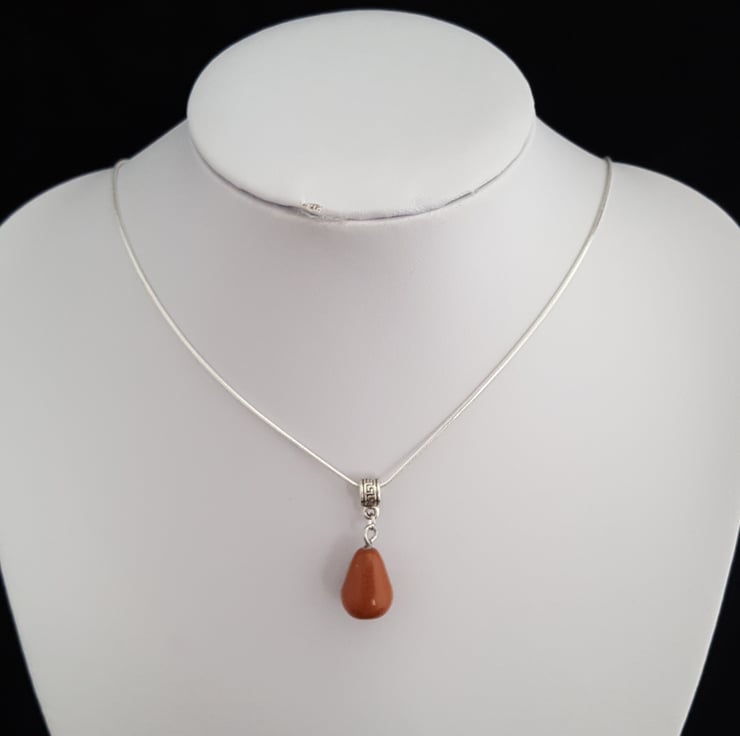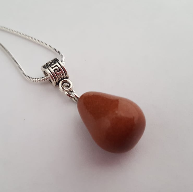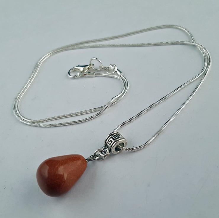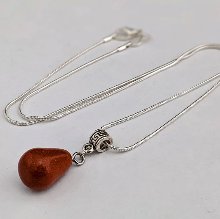 20mm brown goldstone teardrop pendant with Tibetan silver bail on 20" silver plated snake chain.