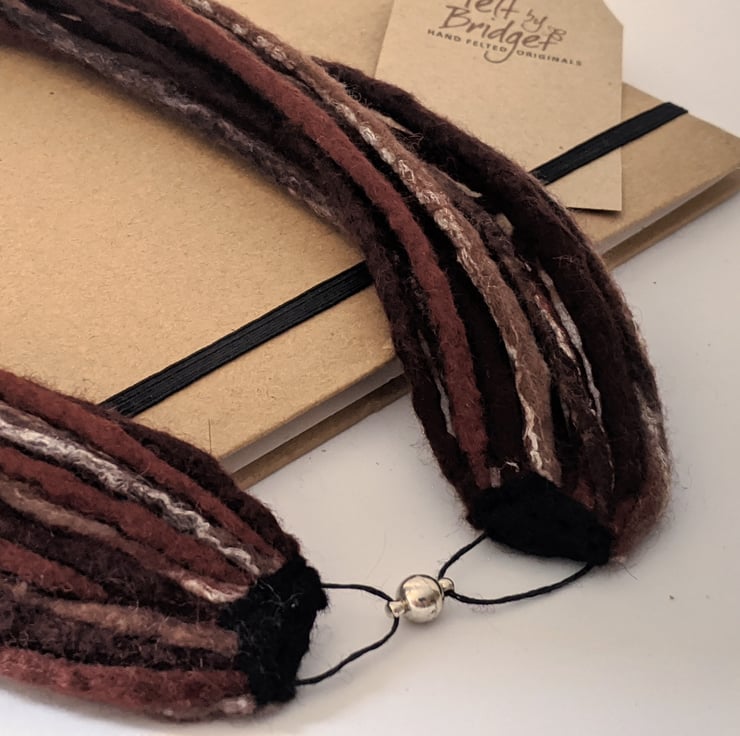 This handmade wet felted necklace is made up of 12 fine felted strands of soft merino wool, in toning shades of brown, including a tweedy blend of browns and silk, graded in length to sit comfortably around the neck. It closes with a strong magnetic fastening.