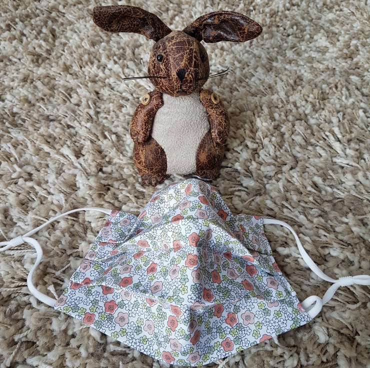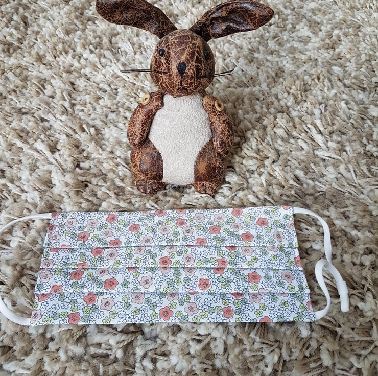 Adult face covering made from a peach poppies print on ivory cotton. The face mask is made with 2 layers of cotton forming an inner pocket for a filter (not included) and is fastened over the ears with 2 loops of elastic and a toggle adjuster.