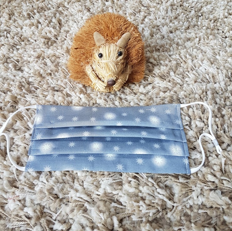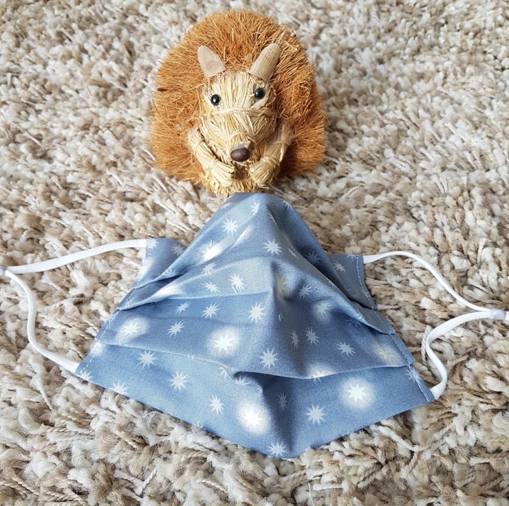 Small Adult/Teenager face covering made from a glow in the dark star print on grey cotton. The face mask is made with 2 layers of cotton forming an inner pocket for a filter (not included) and is fastened over the ears with 2 loops of elastic and a toggle adjuster.