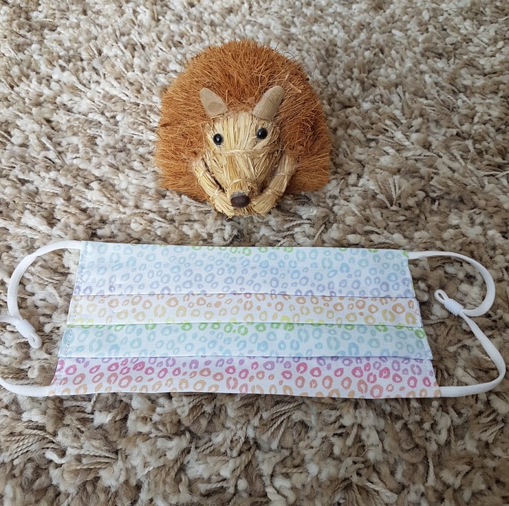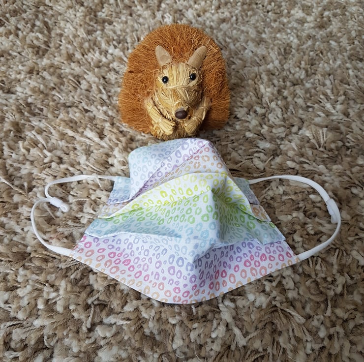 Small Adult/Teenager face covering made from a rainbow animal print on ivory cotton. The face mask is made with 2 layers of cotton forming an inner pocket for a filter (not included) and is fastened over the ears with 2 loops of elastic and a toggle adjuster.