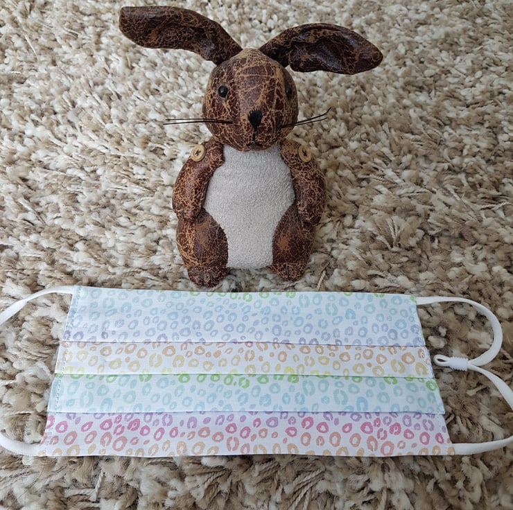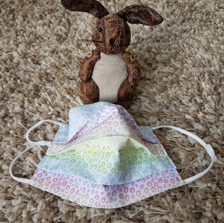 Adult face covering made from a rainbow animal print on ivory cotton. The face mask is made with 2 layers of cotton forming an inner pocket for a filter (not included) and is fastened over the ears with 2 loops of elastic and a toggle adjuster.
