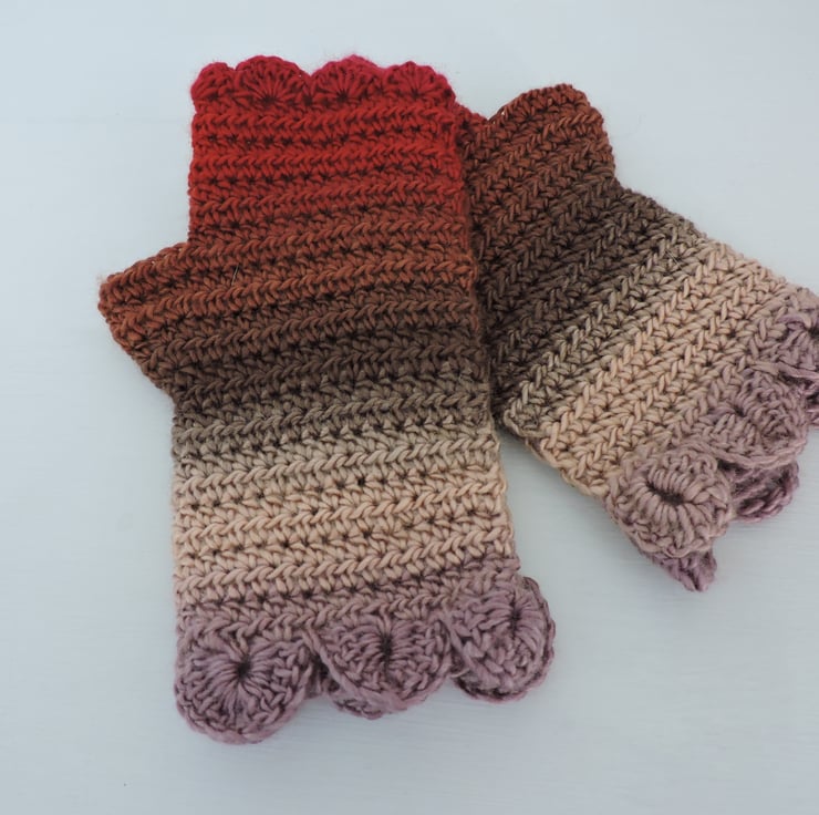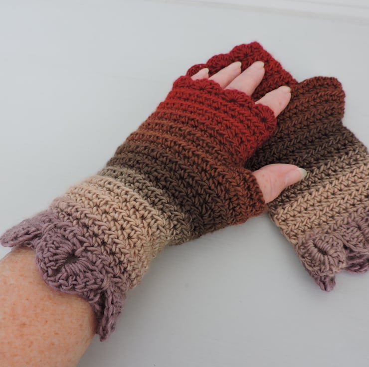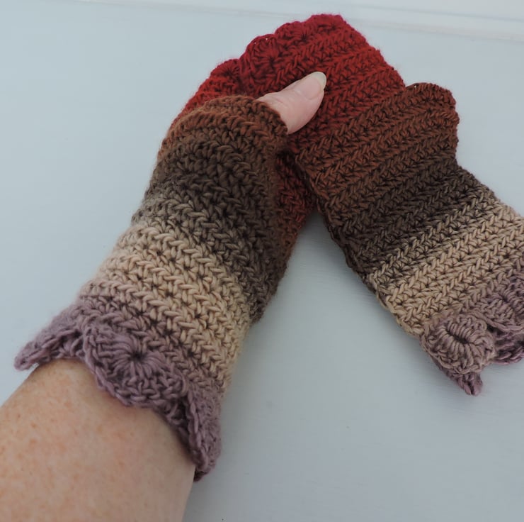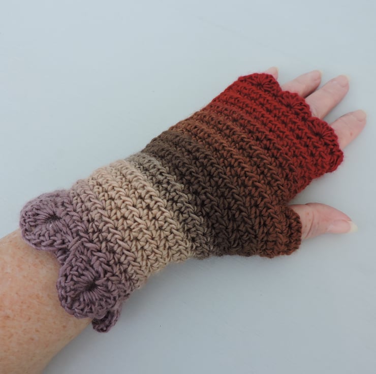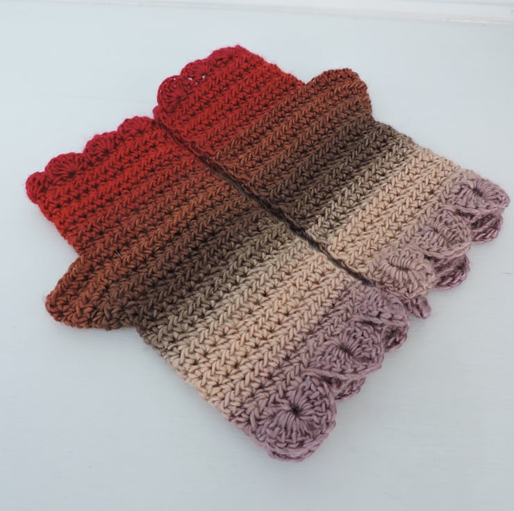 These dragon scale cuff crochet adults fingerless mitts, wrist warmers have been made with a 100% acrylic yarn. Self striping graduated colours of red, copper, brown, cream and mushroom. They have a single row of Dragon Scales at the cuffs and a plain body with a wavy edge finish at the top. Warm and cosy, ideal for the cold weather