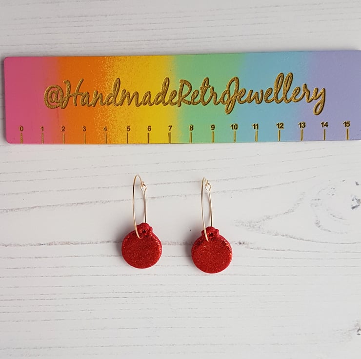 Handmade from polymer clay and glitter, then carefully sanded for smooth edges and finally sealed with gloss to protect