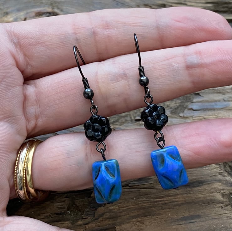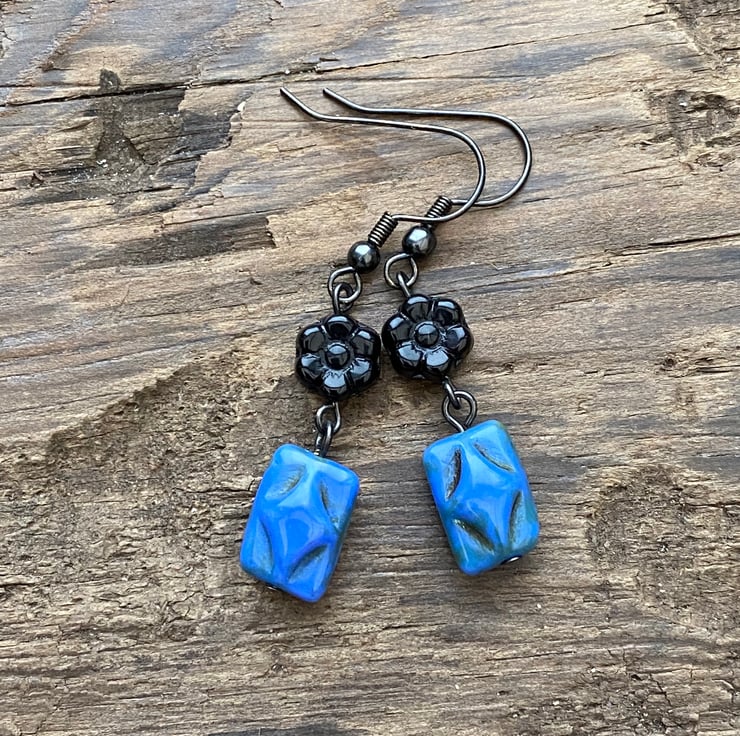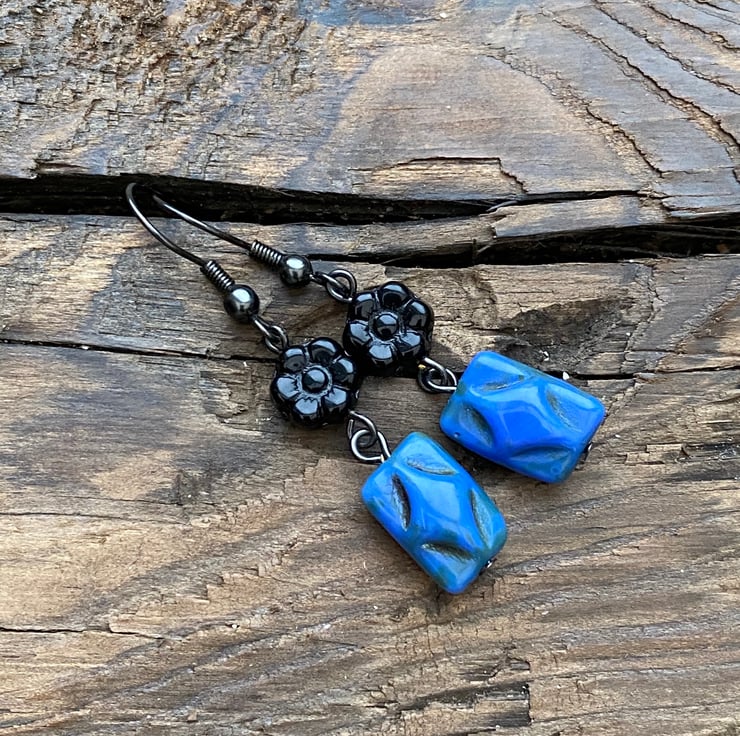 This pair of earrings have been made from Czech glass beads. A black flower and blue rectangular bead. Both hand wired onto antique black brass headpins and connected together. Hung from antique black brass earrings.