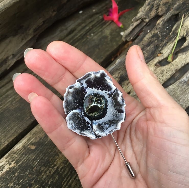 This flower pin will look stunning on a black dress, or worn to brighten up a coat or jacket lapel, hat or scarf.