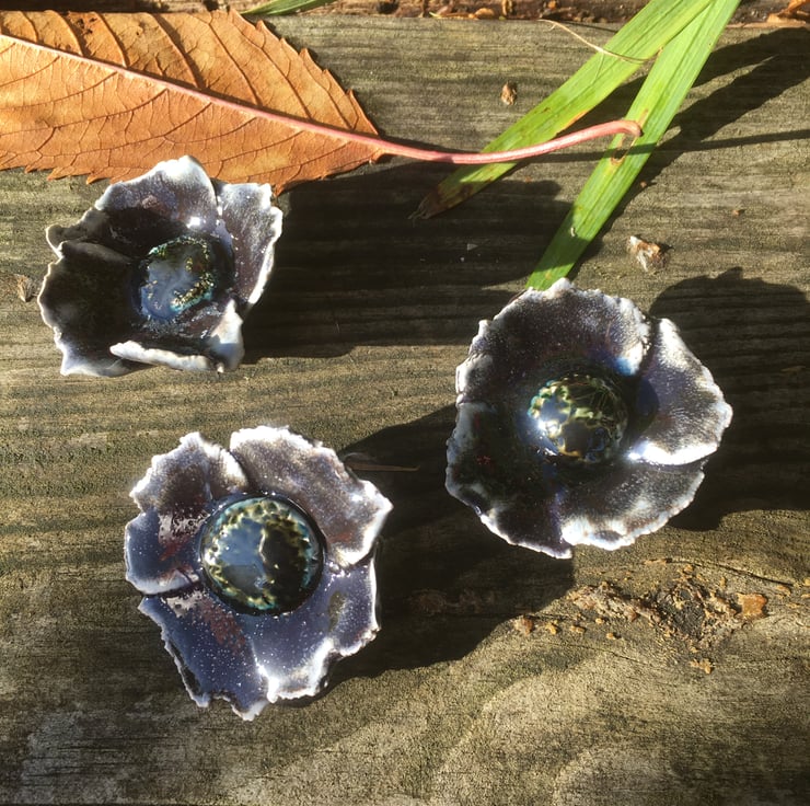 They have been fired in a Rich Purple glaze colour on the petals with a dark metallic pewter coloured centre. I have also made variations of the poppy with a White, Dark Purple/Black, Red, Yellow glaze and an Orange glaze, please see photo's.
