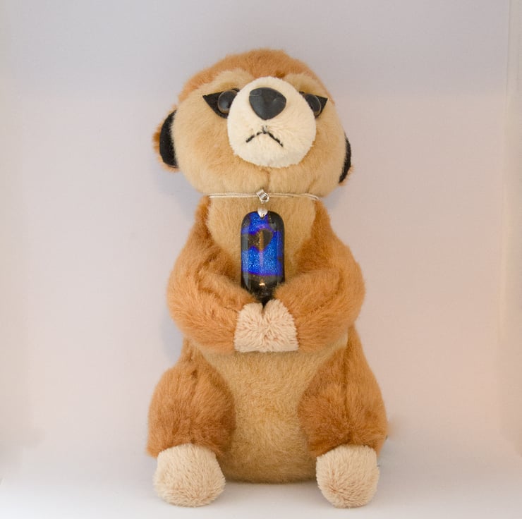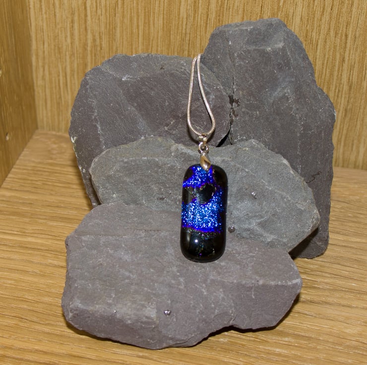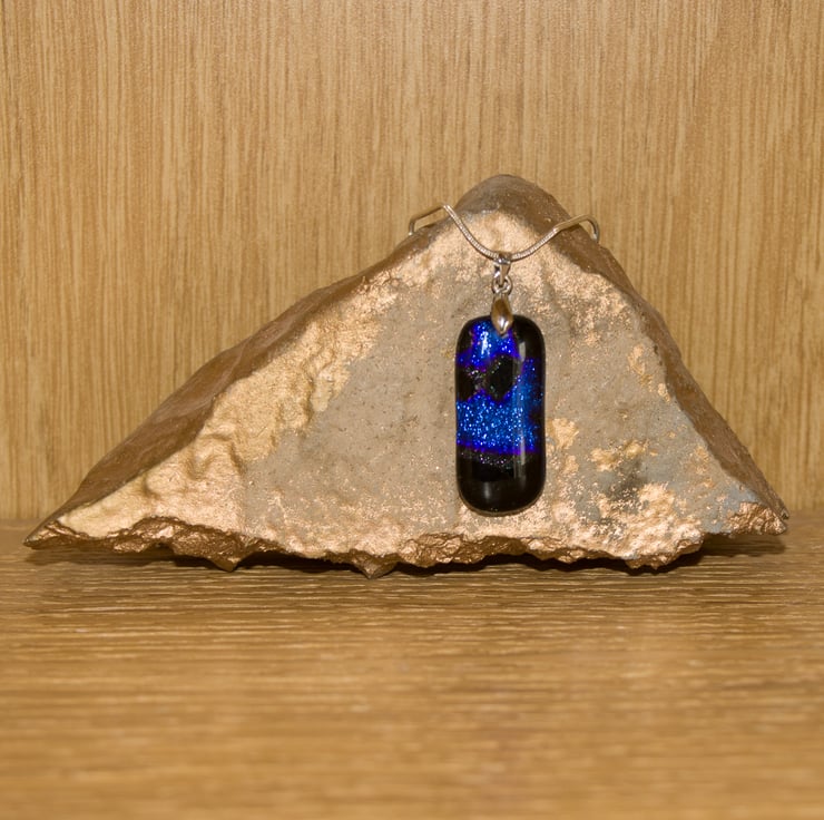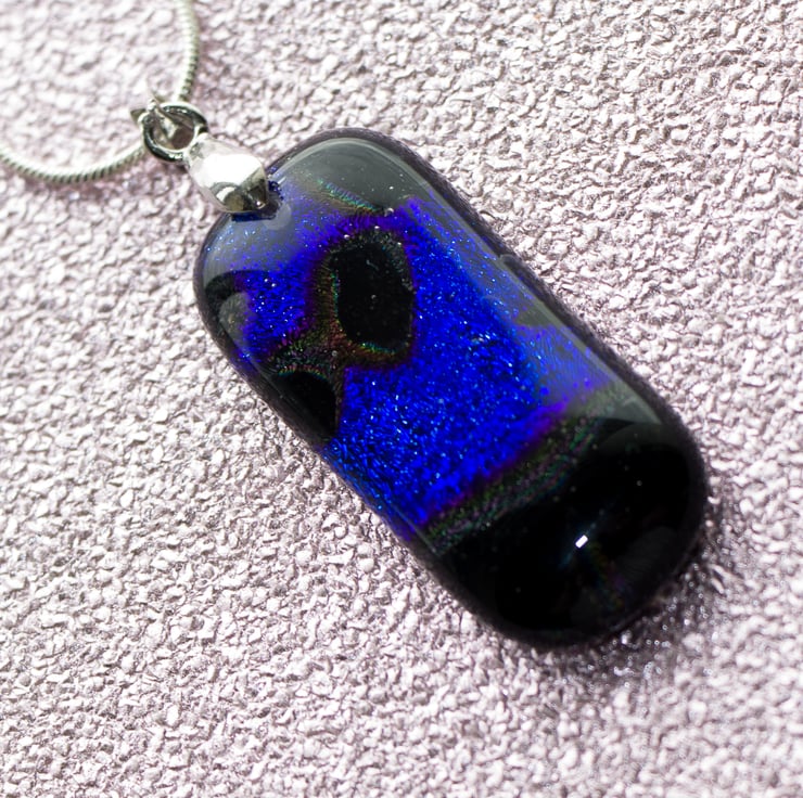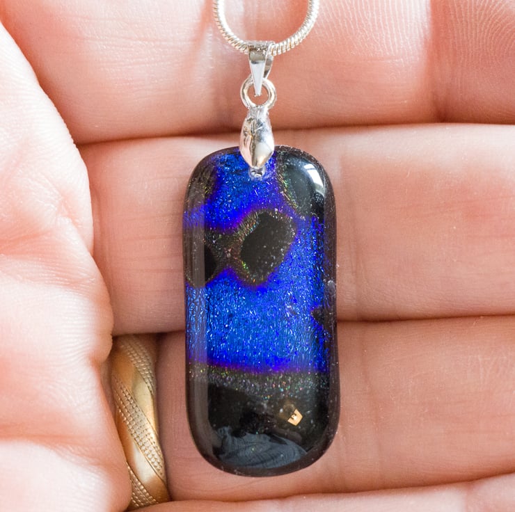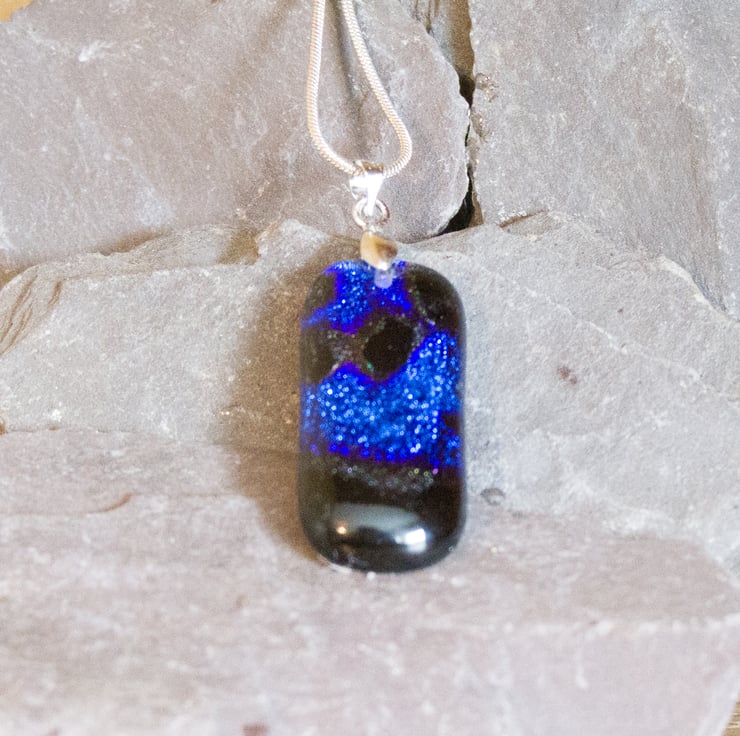 We made this piece using Dichroic Glass which has a metallic coating that gives it the sparkle. We hand-cut and shape each piece of glass before fusing it in our kiln to around 800C. The striking result is a solid piece of glass. Once it's cooled we drill a hole and fit a silver-coloured bail and thread the chain. It is approximately 3.7 cm long and 1.6 cm wide.