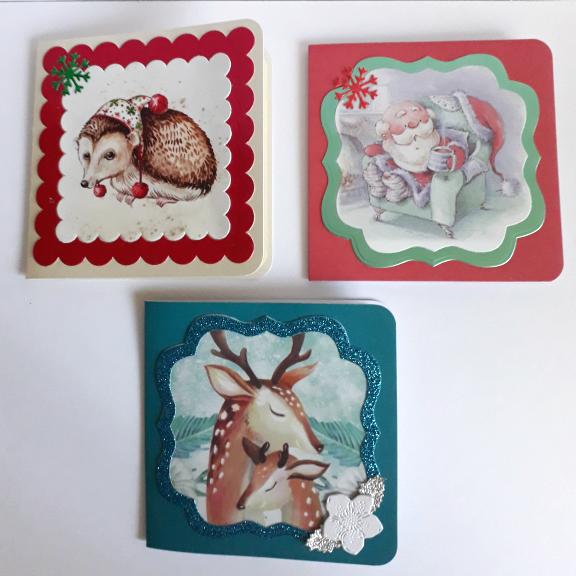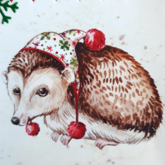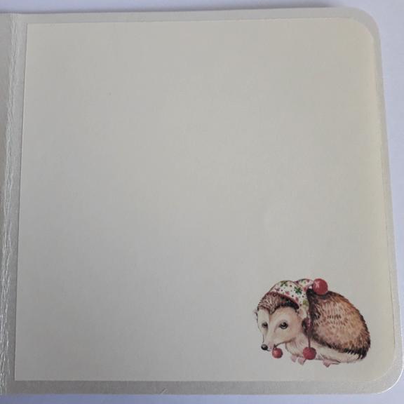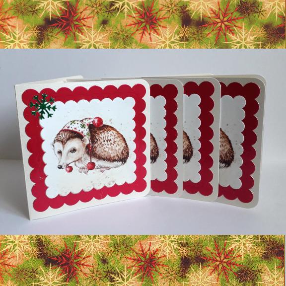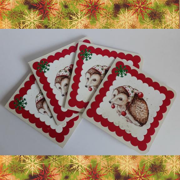 A pack of 4 10cm square Christmas cards featuring a cute hedgehog with his festive pom-pom hat on.
