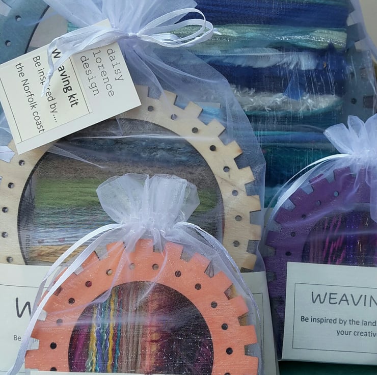The weaving frames have been hand finished with colour and wax to compliment the shades of the kit.