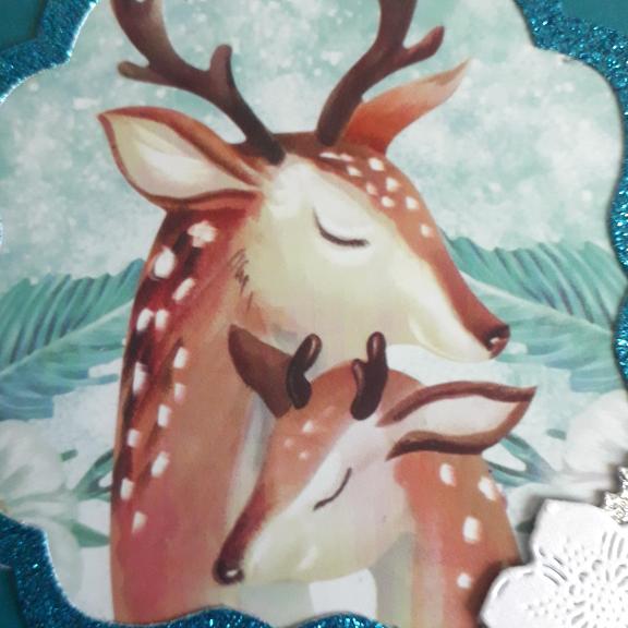 The image has been printed onto glossy photo paper and mounted onto a teal card base, I have placed a frame of glitter card around the image and added a die cut Christmas rose and holly leaves to one corner.
