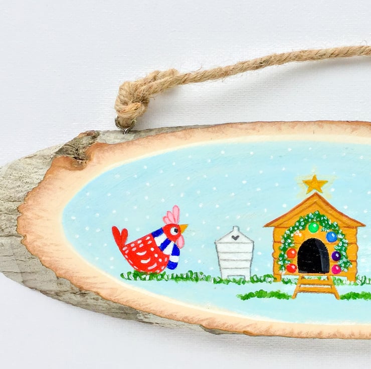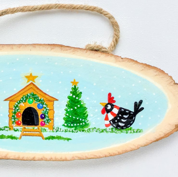 A whimsical hand painted Christmas scene showing two chatting chickens. These chickens are getting ready for the festive period, coop and beehive must be decorated. Painted on a wooden base with a coat of varnish for protection. This would make a lovely present and keepsake for many Christmas’s to come.