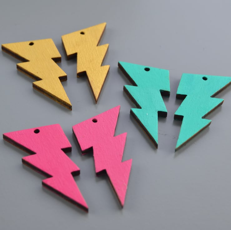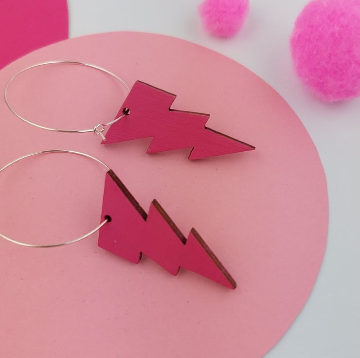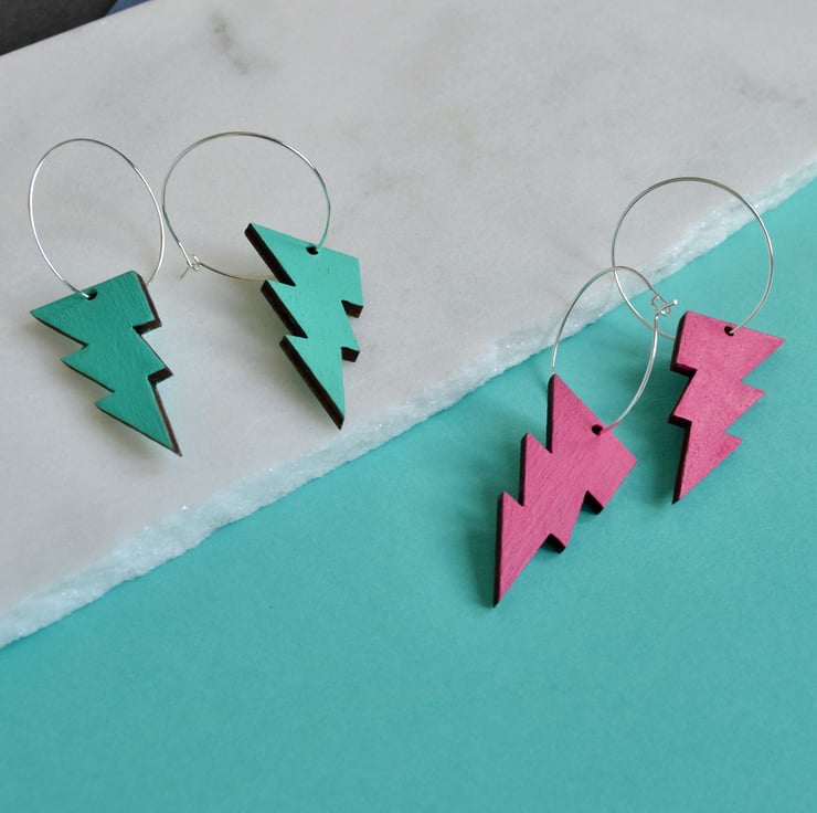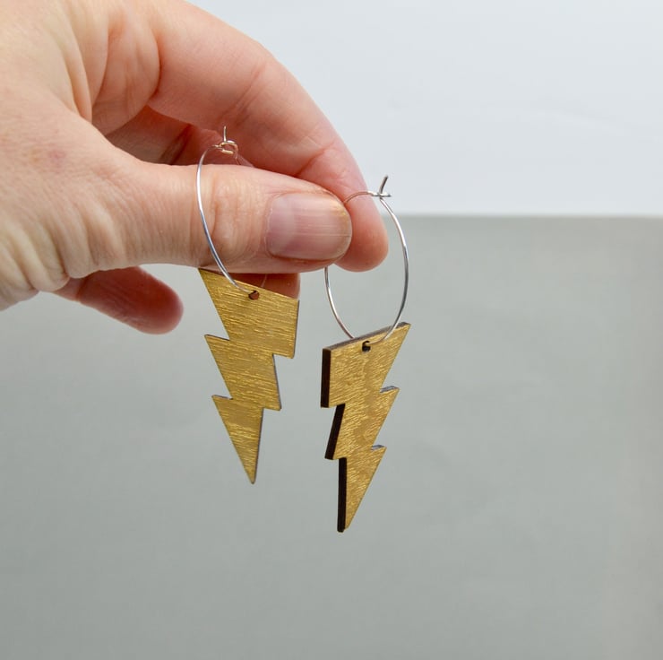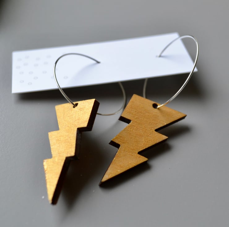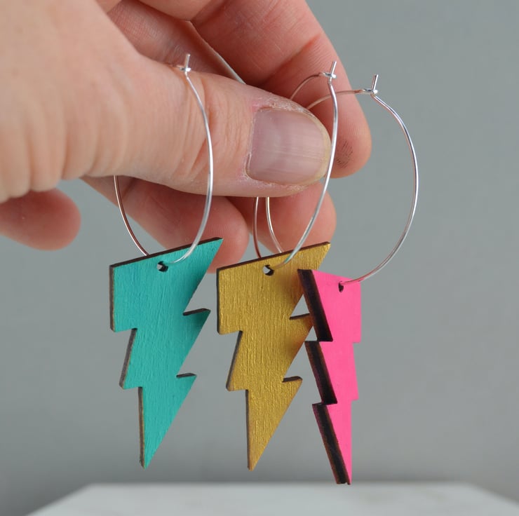 A 35mm silver plated brass hoop earring has a laser cut wooden lightning bolt shape hanging from it. Lightweight and easy to wear, this shape is handpainted by me.