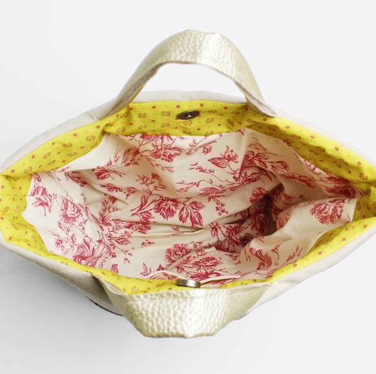 The bag has been made using black and brown wool check fabric for the bottom half and oatmeal linen fabric for the top half, I have used wadding inside so it is a very soft bag. I have hand embroidered rose hips onto the front, and leaves onto the back. There is a hidden pocket on the front of the bag in the seam that joins the two fabrics. The inside facing is made from my mustard Aztec print and the bag is lined with a pink rose print, both on cotton. The handles are made from champagne gold leatherette and wadded for strength and comfort.