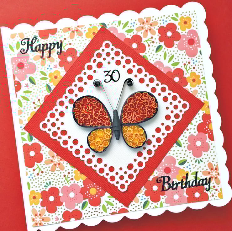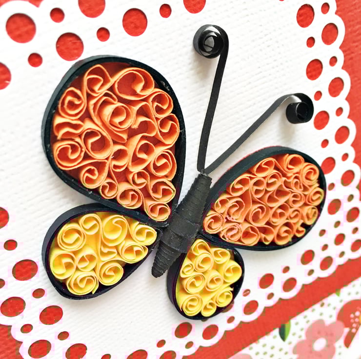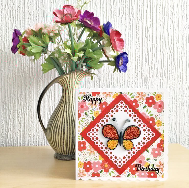 A beautiful birthday card.with a hand-quilled butterfly on a floral gold-foiled background.