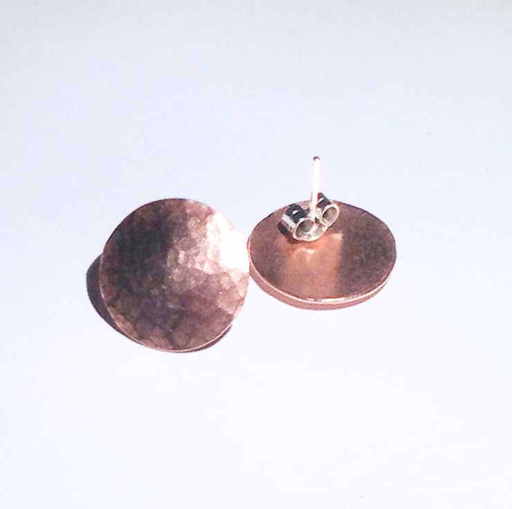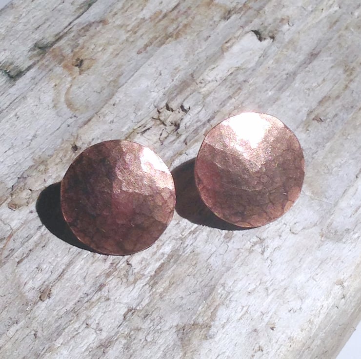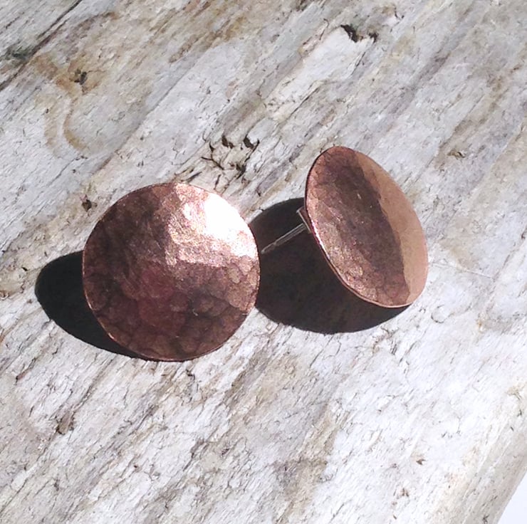 These beautiful earrings are made from hand sawed and hammered copper discs which have been slightly domed for an interesting effect.