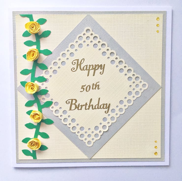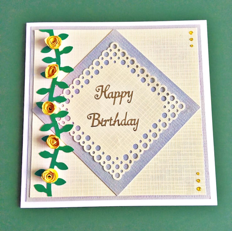 A beautiful hand-quilled birthday card featuring yellow roses.