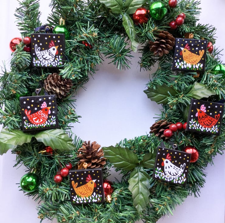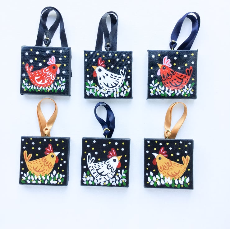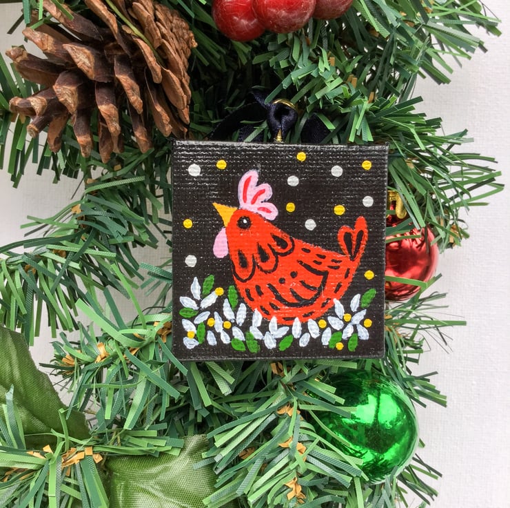 A hand painted cheeky chicken design. Unique and quirky this little canvas will cheer up any tree. Each canvas has been given a coat of gloss varnish for added protection. Fabric backed and a tiny brass screw fixture for a hanging ribbon complements this tiny treasure.