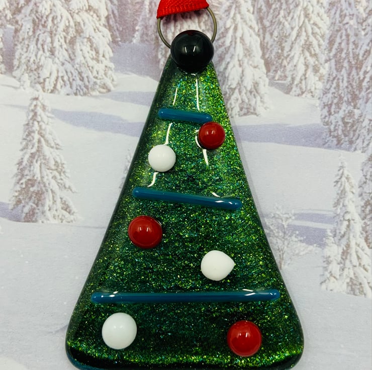 Handmade Fused Glass Xmas Tree Hanging Christmas Decoration.