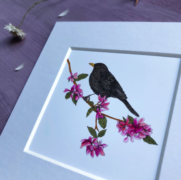 An ice white mounted print of my original artwork, 'Blackbird'.