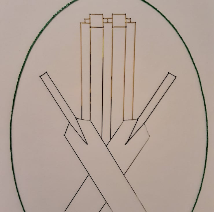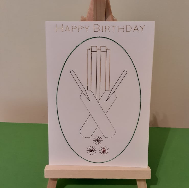 An ideal card for cricket lovers. Hand embroidered in green, gold, silver, black and red metallic thread on a white card with a green insert left blank for your own message.