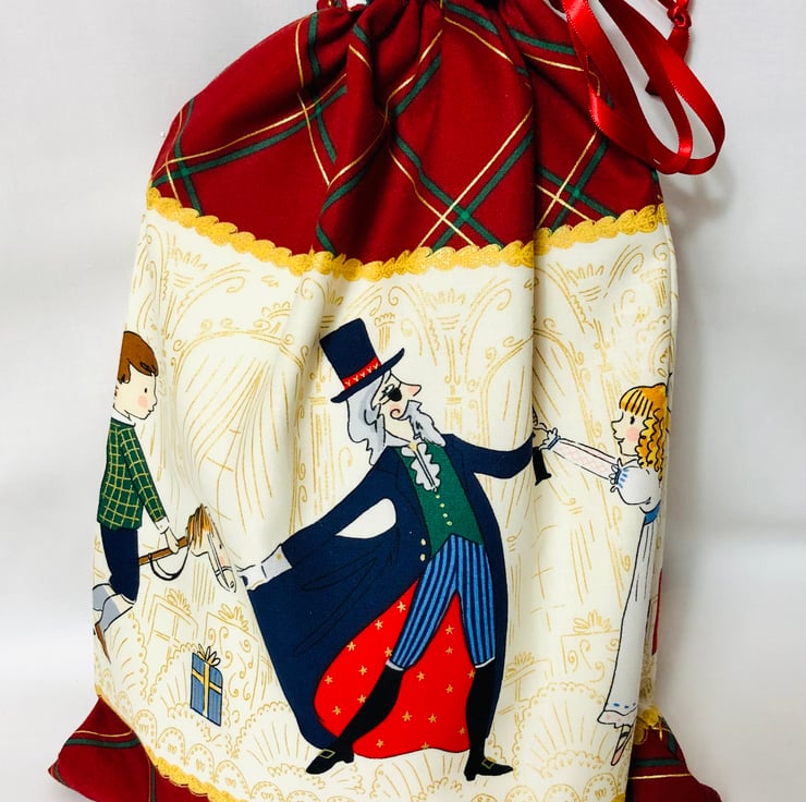 It is made using a pretty nutcracker theme fabric, a white lining and a red ribbon tie.