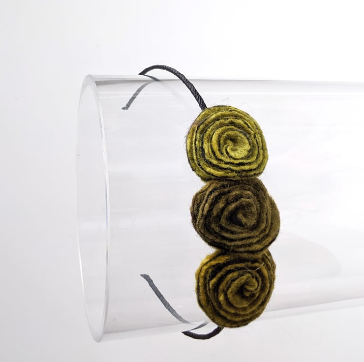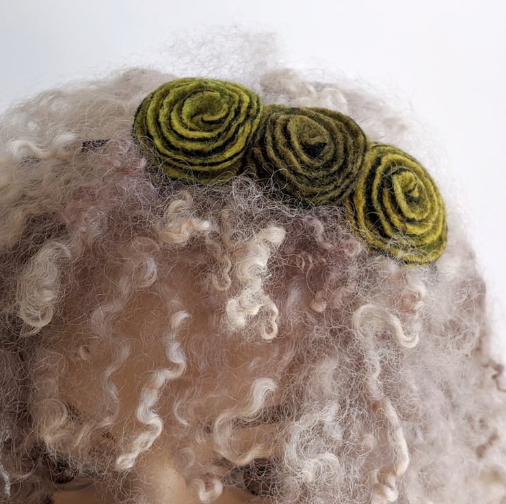 This original design uses three shades of soft olive to make the three felted roses sitting neatly on a narrow black hair band. I have designed the hair band so the flowers can be moved to different positions.