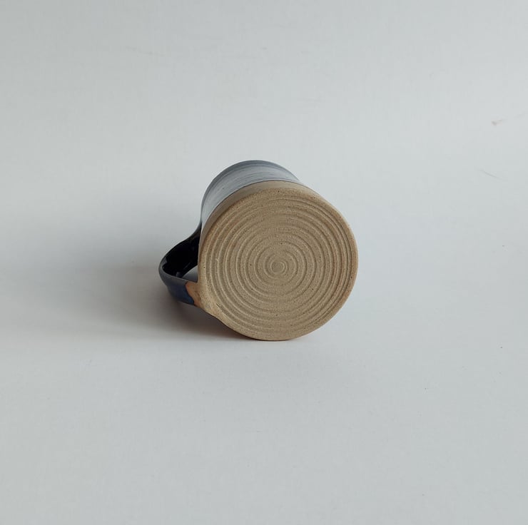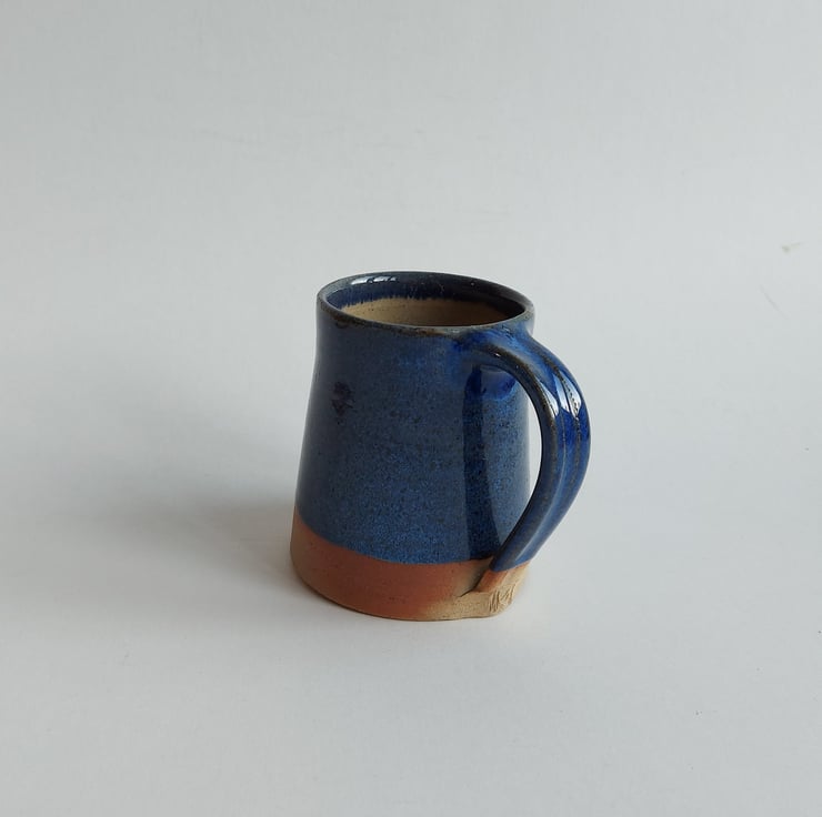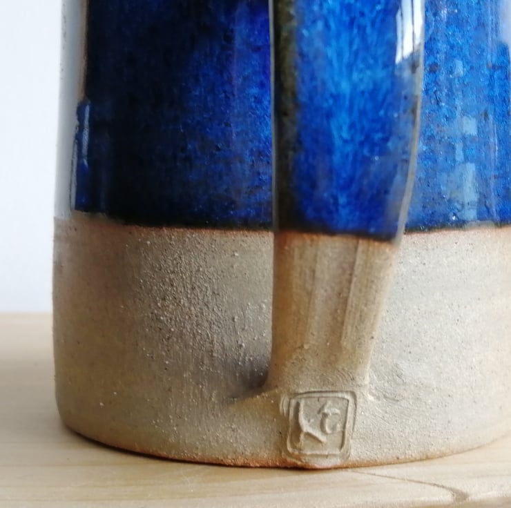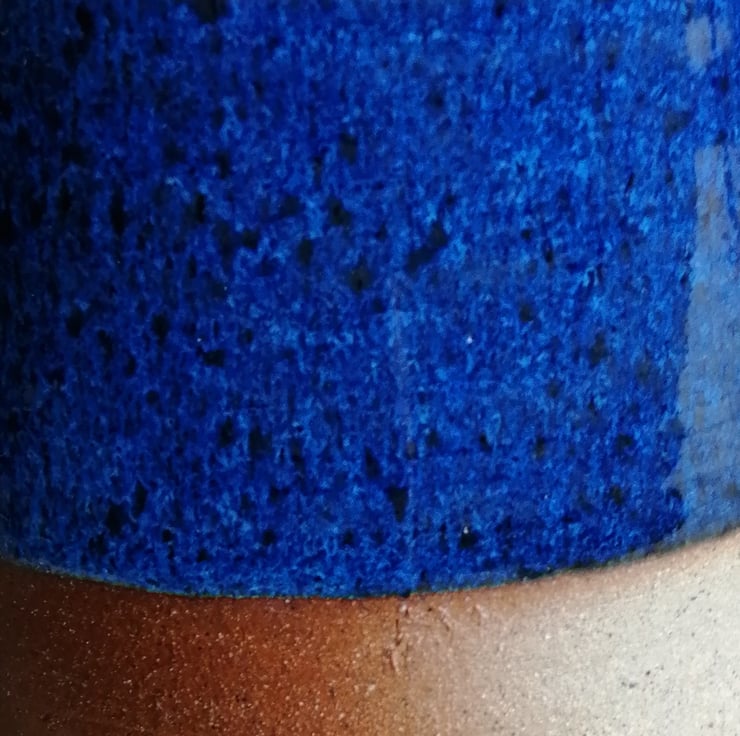 The dark blue glaze has gloss finish with tiny crystals that catch the light and the clear glaze inside the mug allows the colour of the clay to come through.