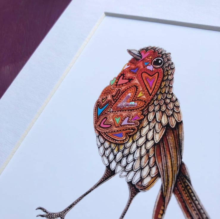 An ice white mounted print of my original artwork, 'Robin Love - Rainbow''.