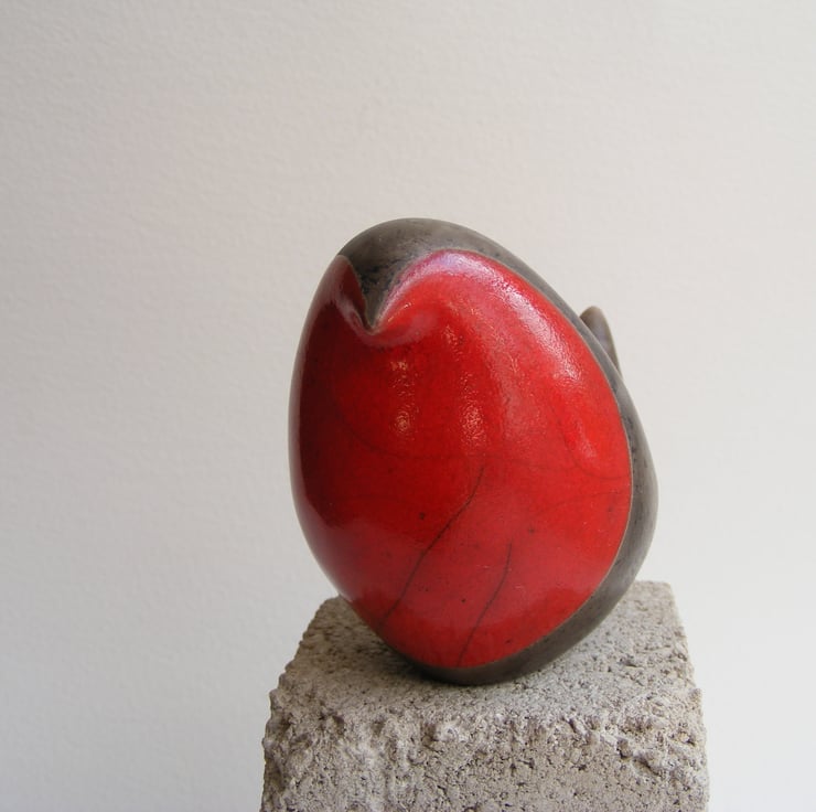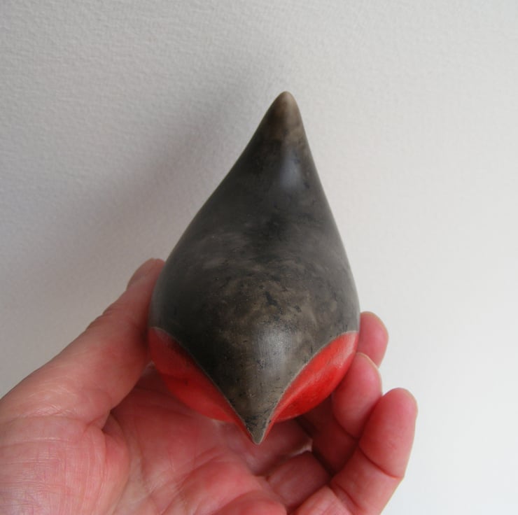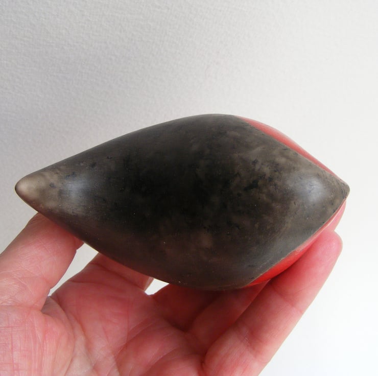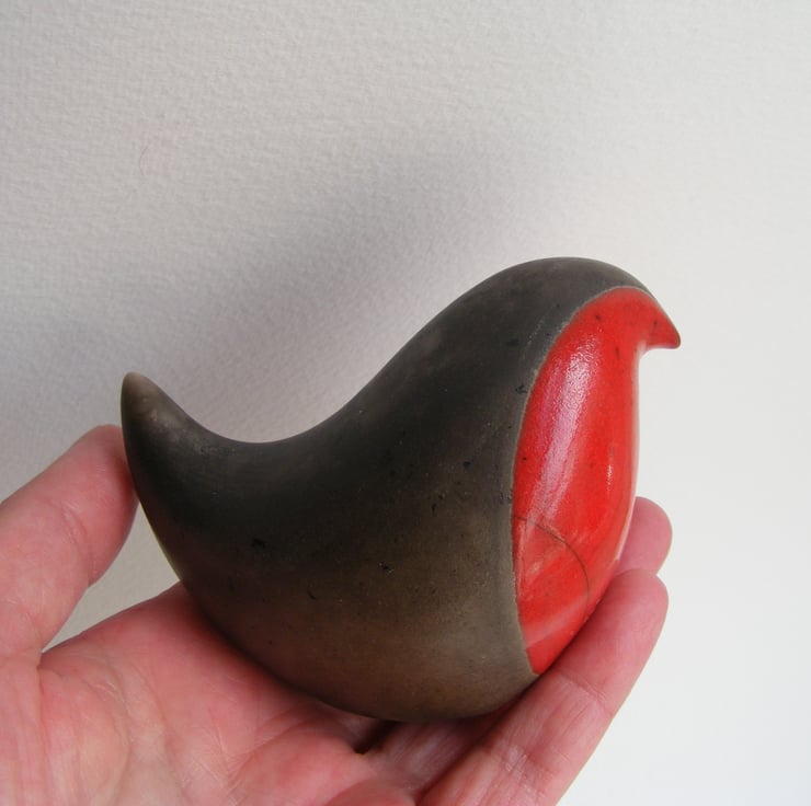 This robin is hand made and measures approx, 7cm high and 8.5cm long. It is made from white earthenware clay and fired first in an electric kiln then the red glaze is painted on the breast and it is raku fired in a gas kiln, the dark part of the bird is unglazed so comes out a black/greyish colour after being smoked in sawdust, sometimes it has sawdust shadows smoked on to the surface. It is then washed, lightly sanded and polished with beeswax.