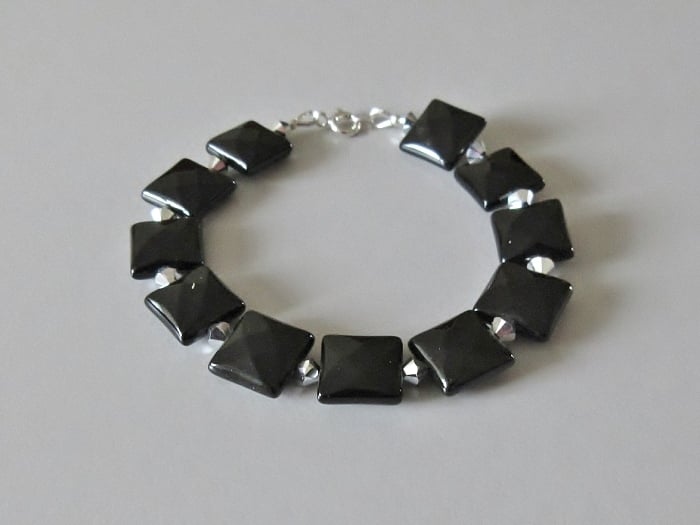 I've used 12mm high quality faceted black Onyx square beads alternating with sparkly silver crystals from the world respected crystal company in Austria.