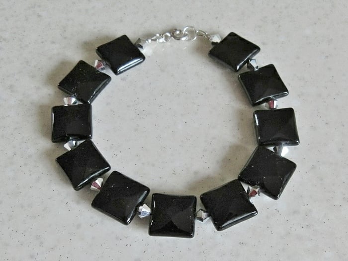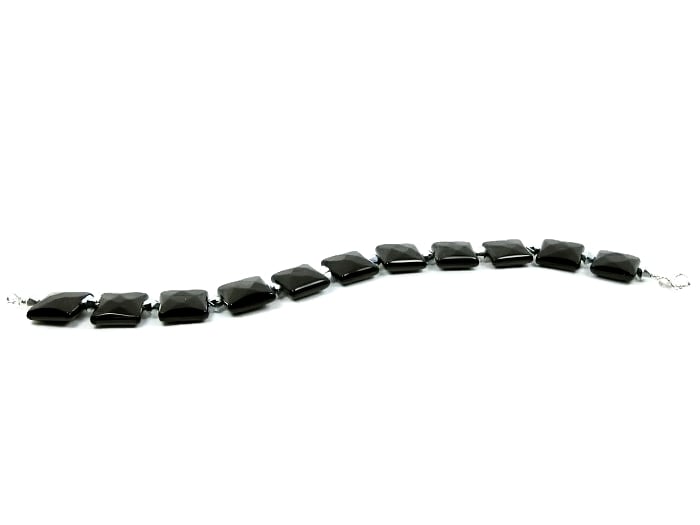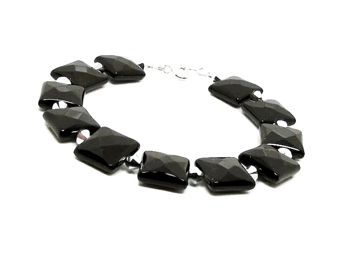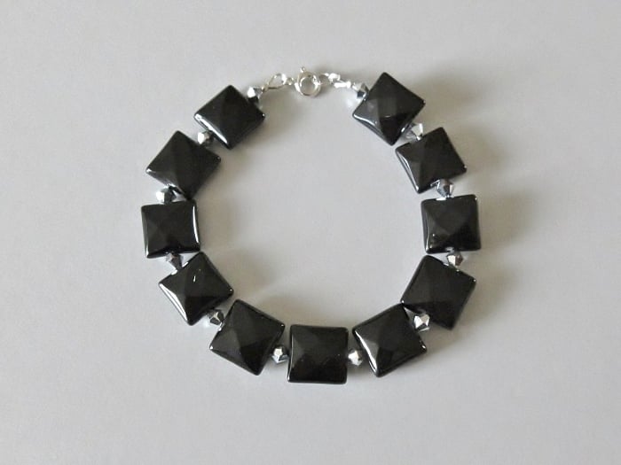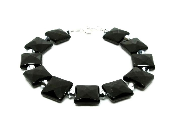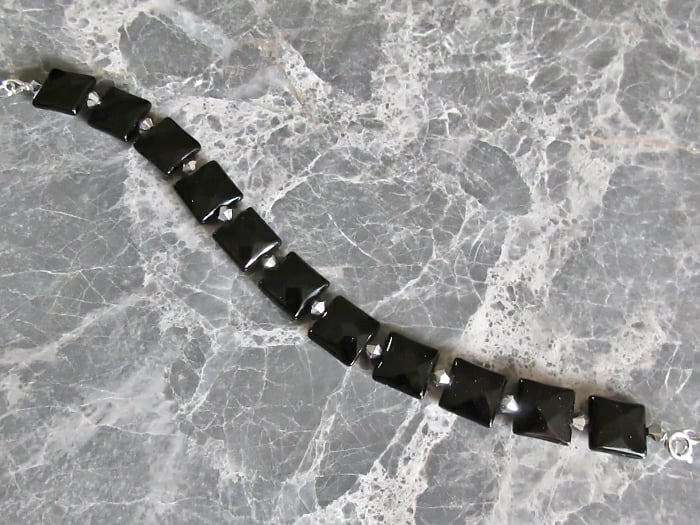 I've used 12mm high quality faceted black Onyx square beads alternating with sparkly silver crystals from the world respected crystal company in Austria.