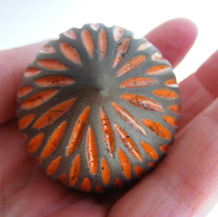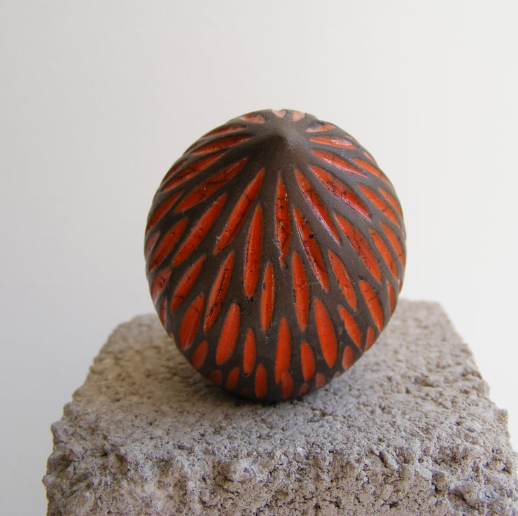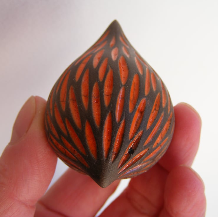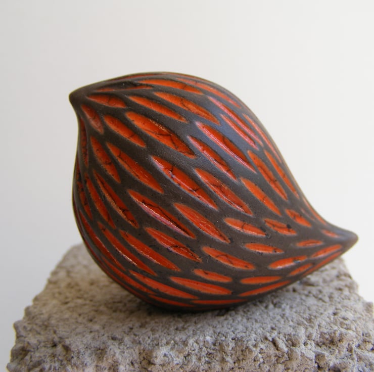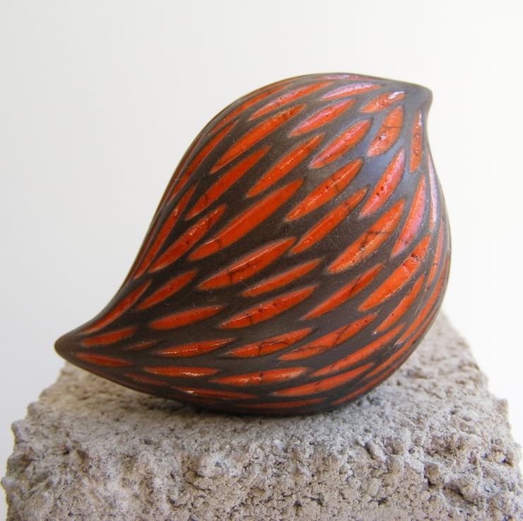 This bird is hand made and measures approx, 4cm high and 5.5cm long. It is made from white earthenware clay and carved before being fired in an electric kiln, it is then covered in orange raku glaze which when dry is wiped back leaving the glaze in the carved indents, it is then raku fired in a gas kiln, the dark part of the bird is unglazed so comes out a black/greyish colour after being smoked in sawdust, it is then lightly sanded and polished with beeswax.