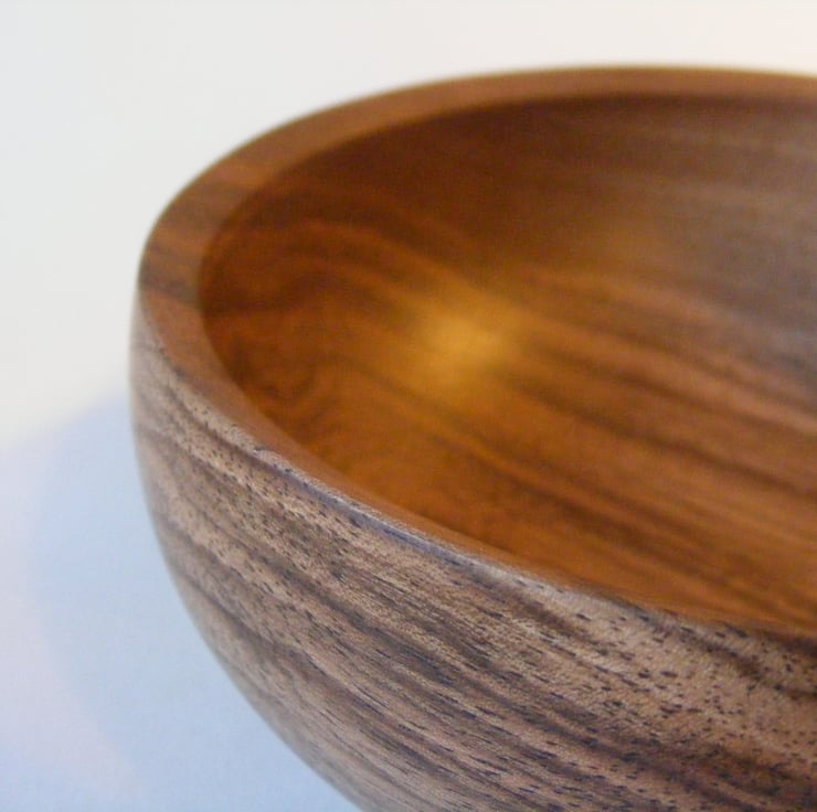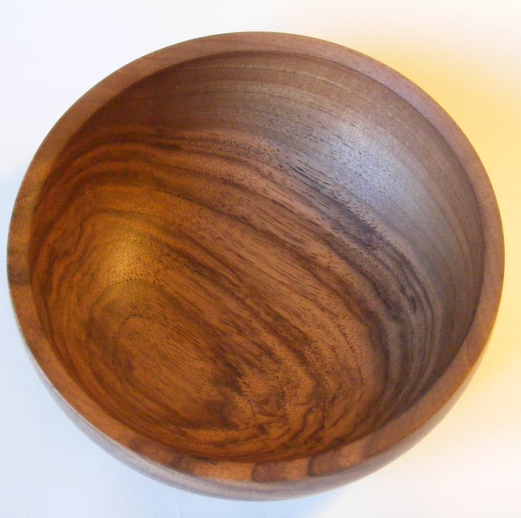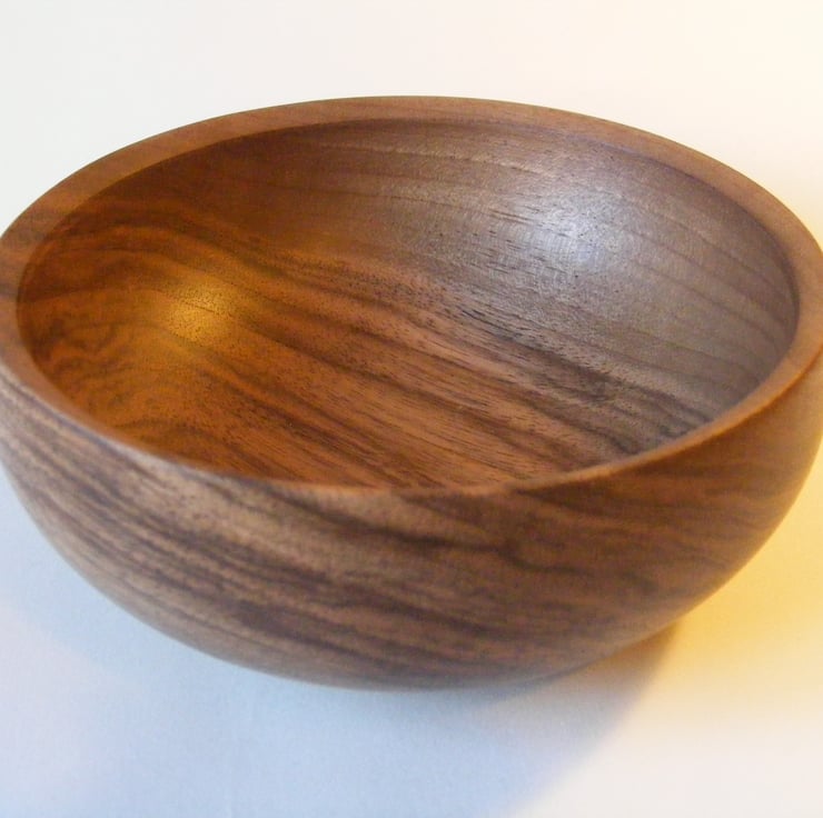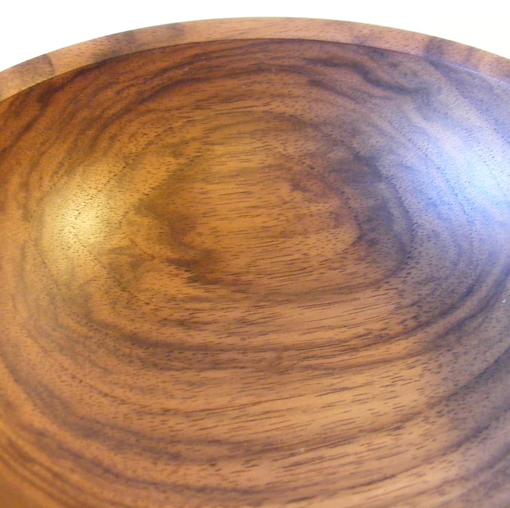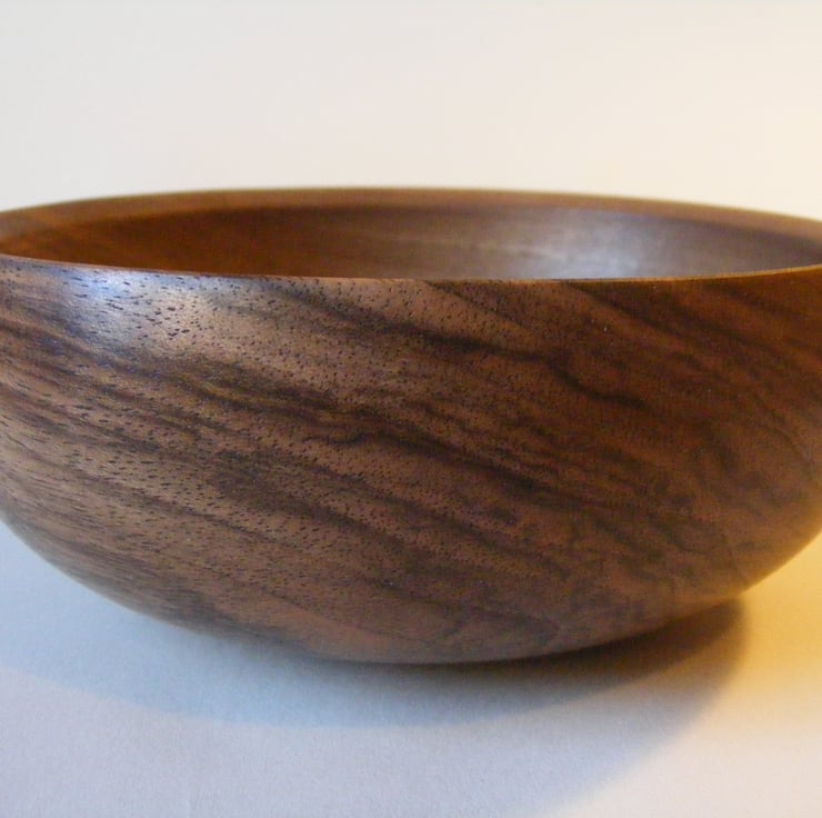 Walnut Bowl, 146mm x 58mm high, finished in Danish oil. A really pretty Walnut bowl with an in curving top, sloped rim and a lovely rounded shape, it has chocolate coloured light and dark streaks in the grain.