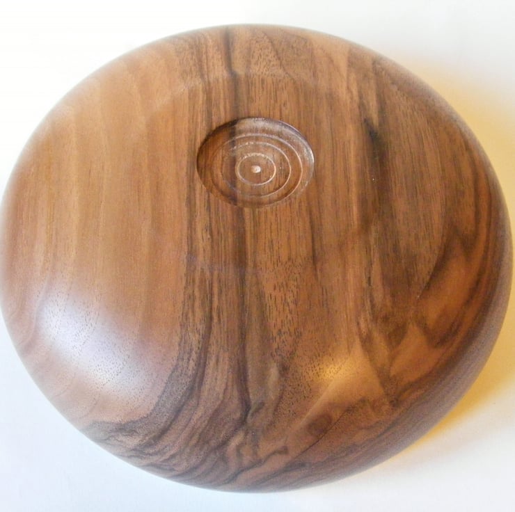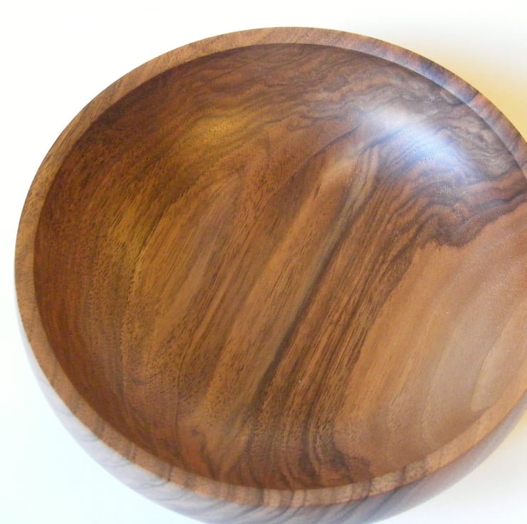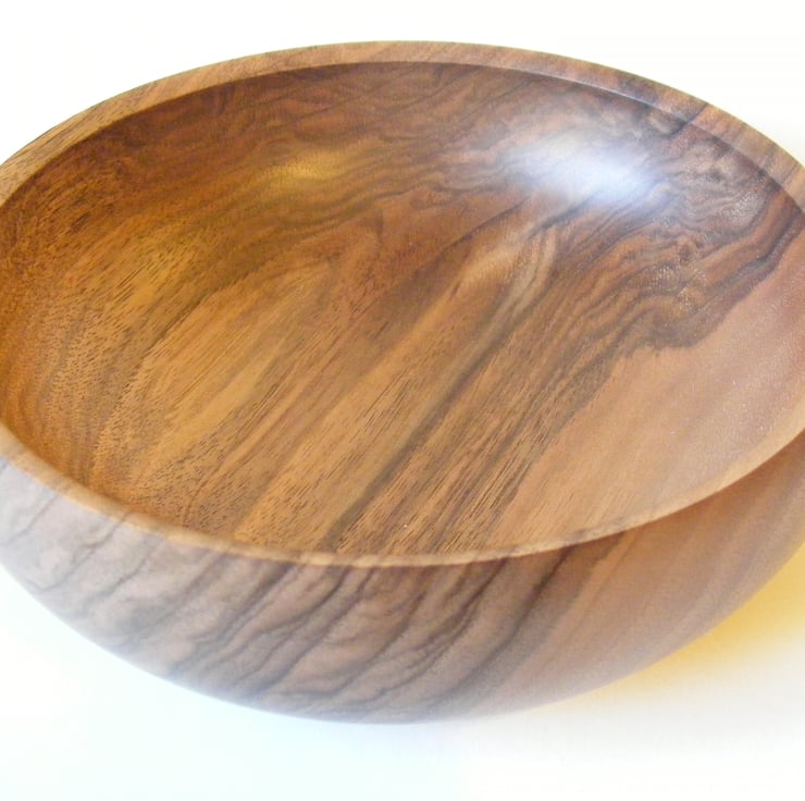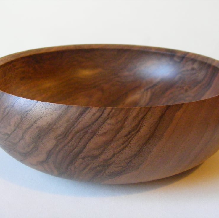 Walnut Nibbles or fruit bowl, 195mm x 63mm high, finished in food safe oil. A lovely Walnut bowl, with a inward curving top and sloped in rim. This has nice streaks of light and dark chocolate brown with some rippled areas. The bowl is of a size for nibbles or even a small fruit bowl or if you prefer just decoration.