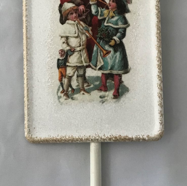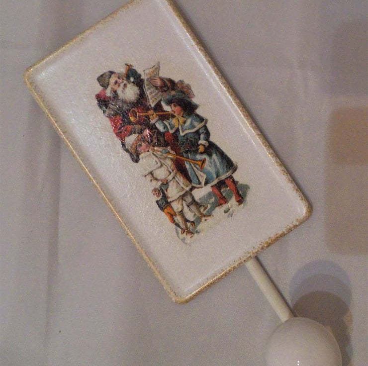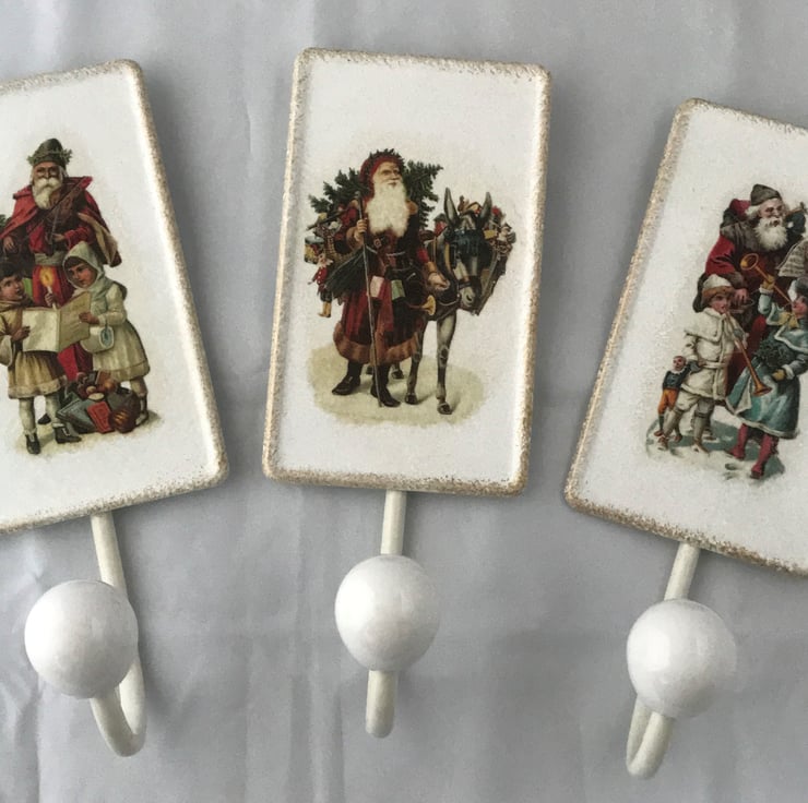 The panel of each hook has been painted, and then decorated with a beautiful rice paper image of a vintage Santa and children, then followed by protective varnishing.