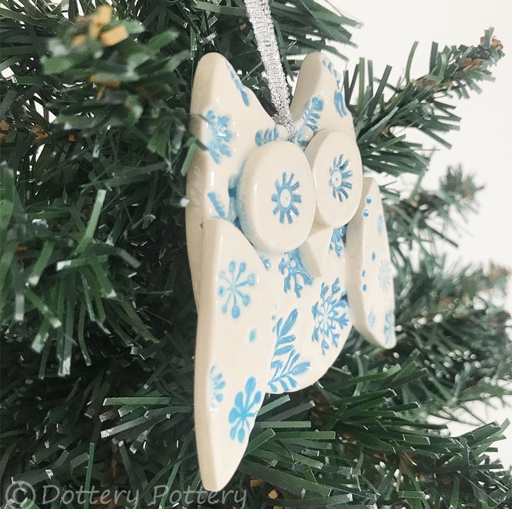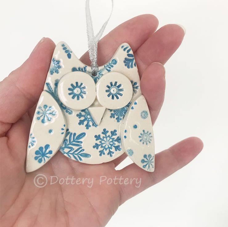 This cute little owl is made from white earthenware clay. Each part has been embossed with pattern and then cut from hand made templates. Finished with a silver string It measures 7cm high by 6cm wide by 1.5cm deep. Glazed on the front, plain cream clay colour on the back. This listing is for one owl only.
