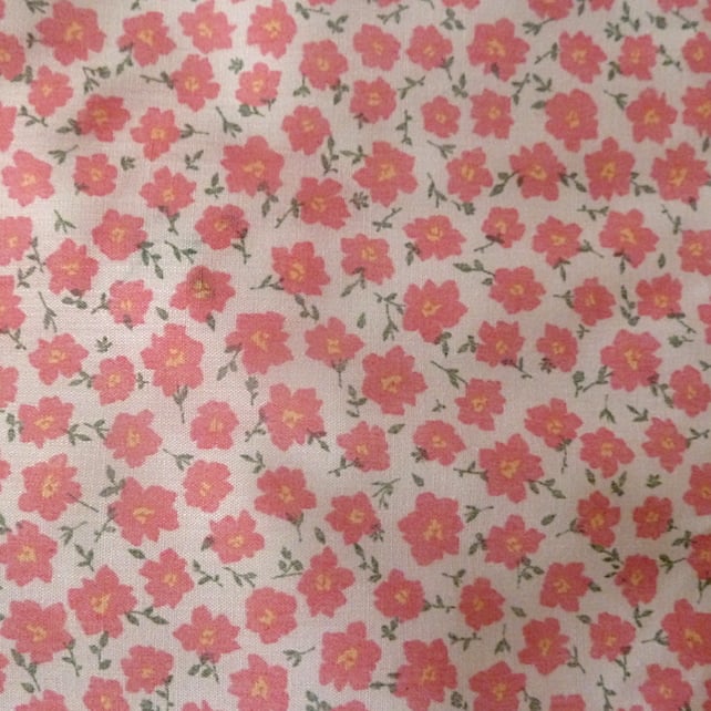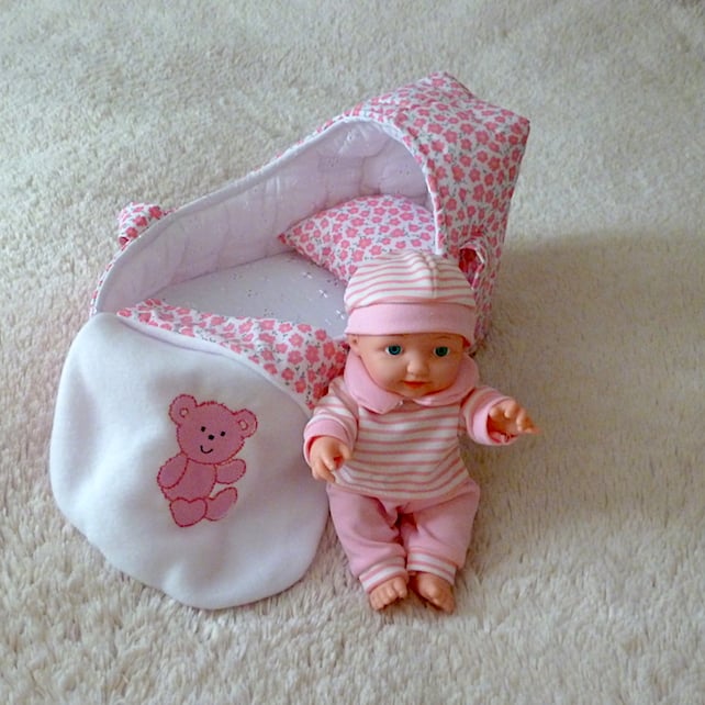 This pretty small doll's carrycot is made from polyester cotton which has a pink background and a small white flower design.