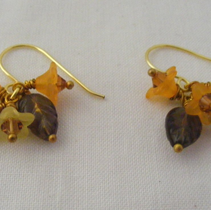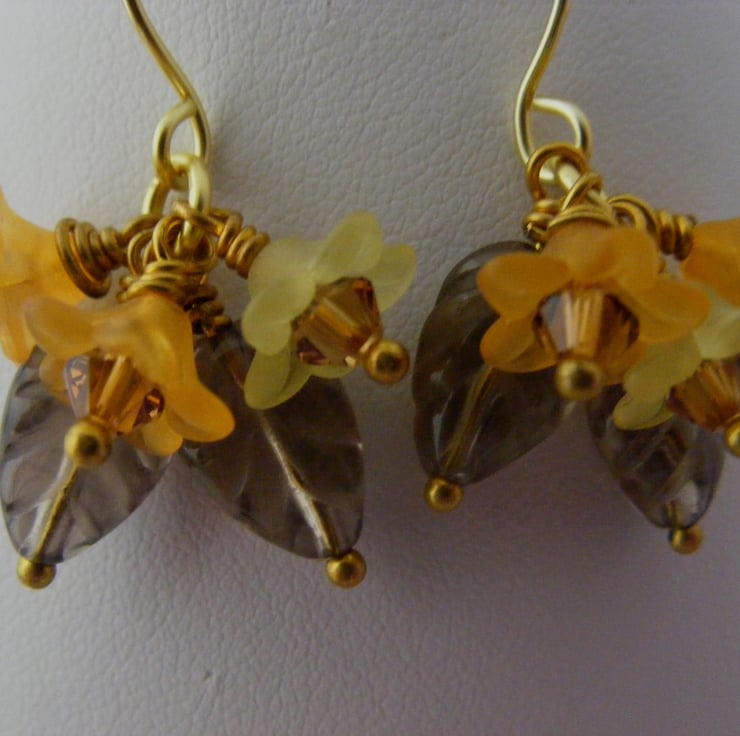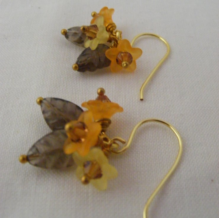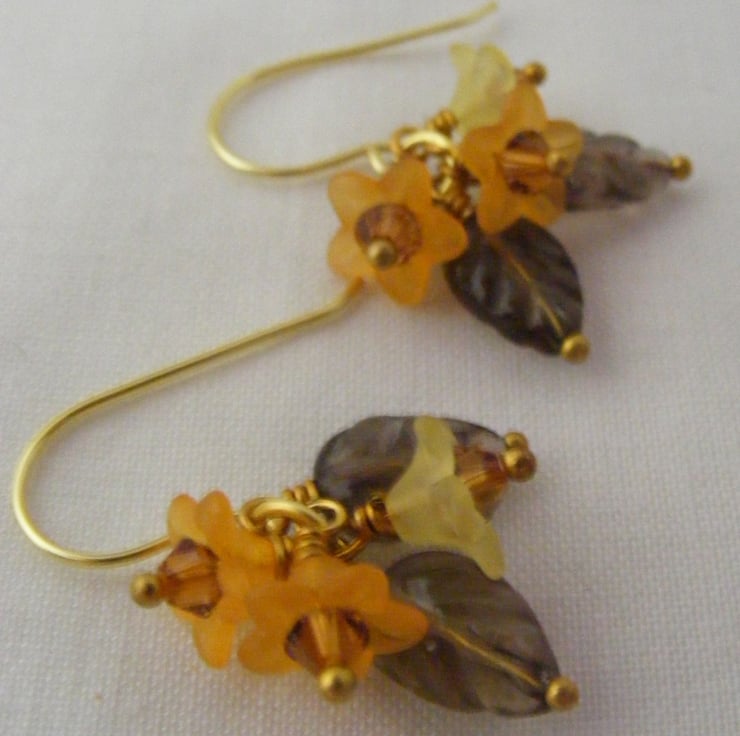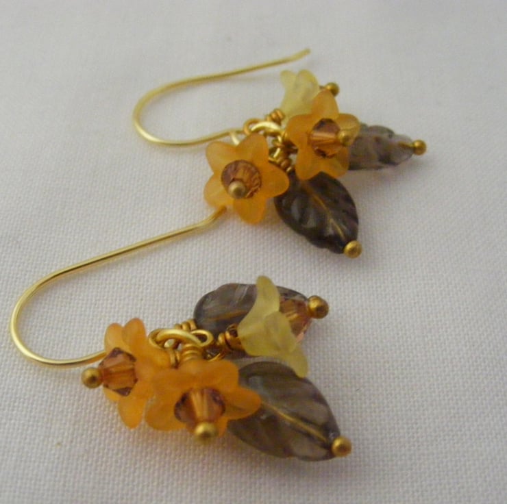 9 mm orange and yellow Lucite flowers, 4 mm Swarovski light smoked topaz crystals, gold plated headpins and wire. Wire is hypo allergenic and resistant to tarnishing. Ear wires are handmade.
