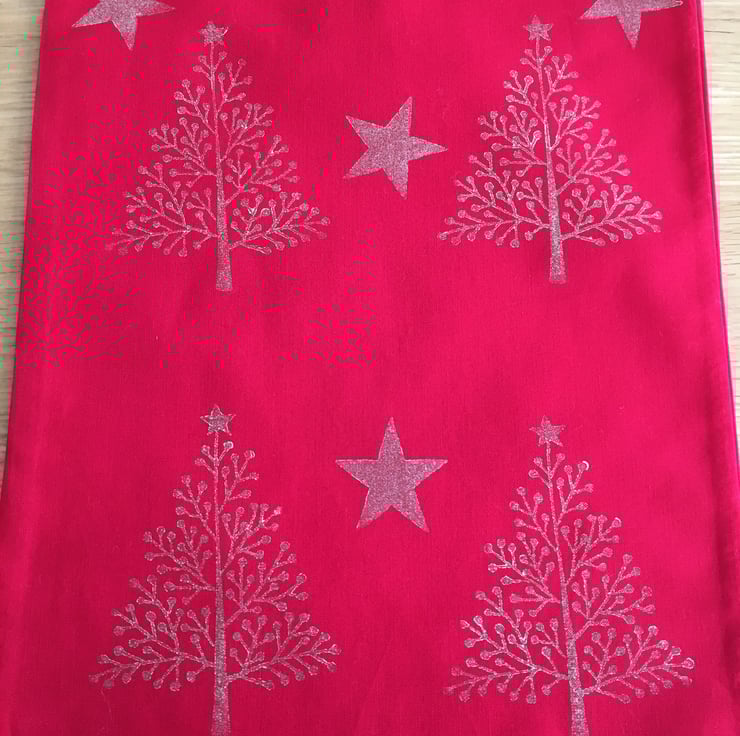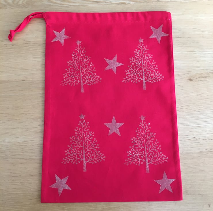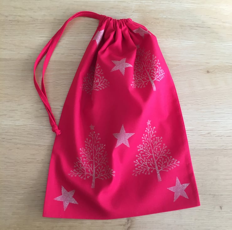 Hand block printed red cotton drawstring bag measuring approx 24cm by 34cm. Makes a perfect eco friendly gift bag or stocking. It is hand block printed on both sides.